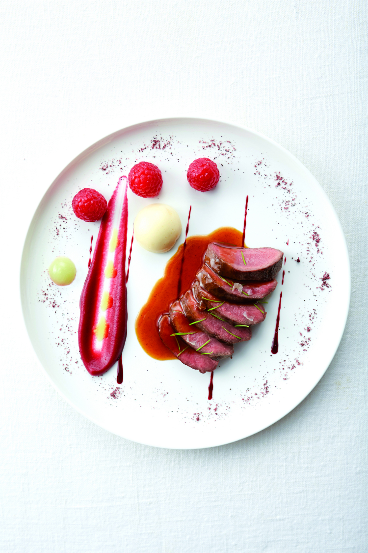 À la carte de son restaurant se découvre le tropisme pour le gibier d’un passionné chassant à l’approche, qui est à l’art cynégétique ce que la pêche à la mouche – qu’il adore également – est à la pratique halieutique : un modus operandi solitaire et aristocratique. Il est quatre heures trente du matin. La nuit est encore d’encre lorsque nous retrouvons Olivier Nasti. Le 4×4 démarre en souplesse en direction d’Orbey. « C’est une chasse raisonnée et raisonnable. J’observe l’animal à la jumelle et décide s’il est bon à prélever ou pas. Il est essentiel de gérer l’espace et l’espèce », explique-t-il en roulant. Nous marchons silencieusement. Les contours des arbres se précisent peu à peu. Le chef lit dans la forêt comme dans un livre ouvert, analysant les traces des animaux et les indices de leur passage : « Ces noisettes encore vertes ne sont pas tombées toutes seules. Et vu la hauteur de l’arbre, c’est sans doute un grand cerf qui s’y est attaqué », estime-t-il. Alors que les ténèbres luttent encore consciencieusement avec le jour, nous apercevons un faon au loin, puis un broquart, à quelques dizaines de mètres. Pas un coup de feu. Le Meilleur Ouvrier de France nous vante en chuchotant les mérites du gibier tué à la belle saison : « La viande d’un cerf chassé en été est merveilleuse. Il se nourrit d’herbes grasses qui rendent sa chair tendre et juteuse. C’est magique », affirme celui qui approvisionne sa table avec le produit de ses chasses, travaillant également avec des professionnels soigneusement sélectionnés dans une volonté de « traçabilité maximale. J’évite les bêtes tuées à la traque, car elles ont beaucoup d’acide lactique dans les chairs en raison du stress et de la course. » La marche se poursuit dans la lumière incertaine de l’heure bleue. Sur les pentes du Lac noir, on aperçoit des chamois au loin, une viande que le maestro cuisine à la demande.