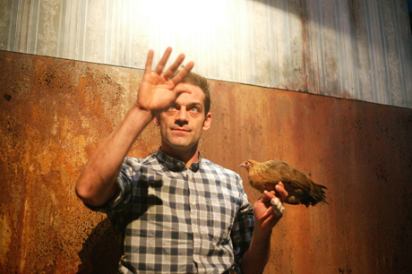 Quelques mois après cette création, Jean-Yves reprenait, en novembre dernier, une pièce de 2001 : Erwan et les oiseaux. Librement inspiré des Oiseaux de Tarjei Vesaas, ce spectacle jeune public s’attache à la figure d’Erwan, jeune homme un peu attardé à la langue poétique, coincé entre sa sœur qui en a la charge et son amoureux, bûcheron tentant de lui apprendre son métier. Poétique et pathétique, tendre et incompris, Erwan s’obstine à exécuter de travers les tâches quotidiennes, révélant ainsi l’absurdité de leur répétition – « J’ai mis le feu aux fagots, c’était beau, il m’a traité de blaireau » confie-t-il à sa sœur, un jour en rentrant.