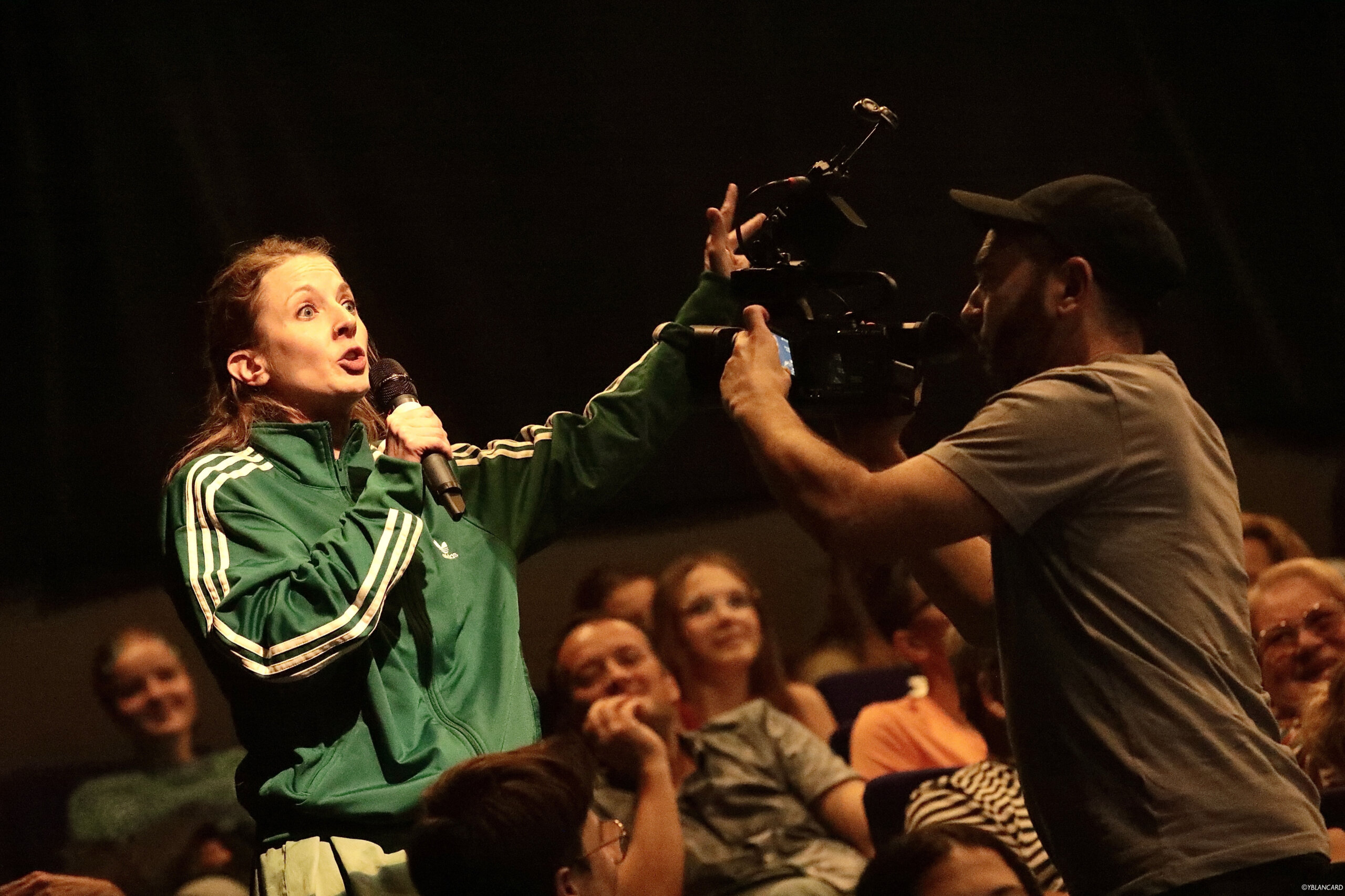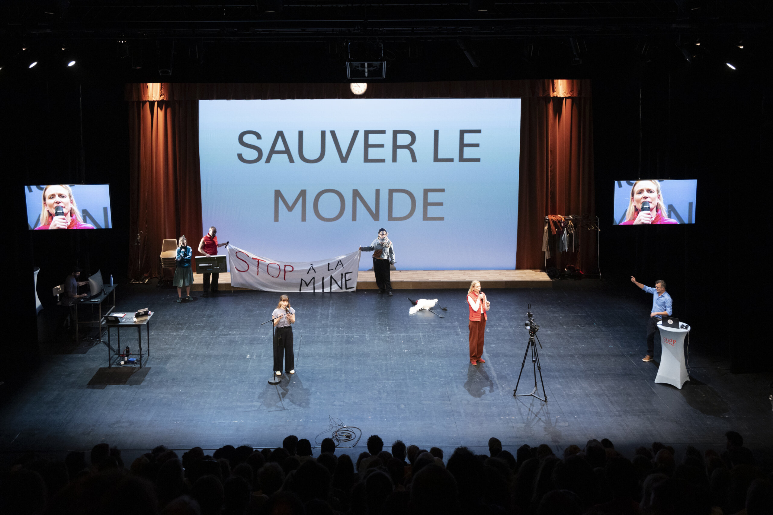 On modifie tous les noms, afin de produire un décalage et une certaine absurdité, mais aussi parce qu’au-delà du sujet local, nous voulions faire un spectacle universel. L’absurde nait du monde réel, il suffit donc de peu pour le révéler. Et puis, comme les débats publics ont souvent lieu dans des salles des fêtes, on s’en inspire en utilisant les mêmes mange-debout, assez laids, avec leurs jupes tout aussi hideuses. Des écrans retransmettent en direct les prises de parole, la caméra se balade dans le public pour aller chercher ceux qui veulent participer – pendant la représentation, on fait justement distribuer des petits papiers avec des questions pour les volontaires –, des visuels explicatifs sont projetés… Le but est de reproduire une sorte d’effet de réel, de briser le quatrième mur.