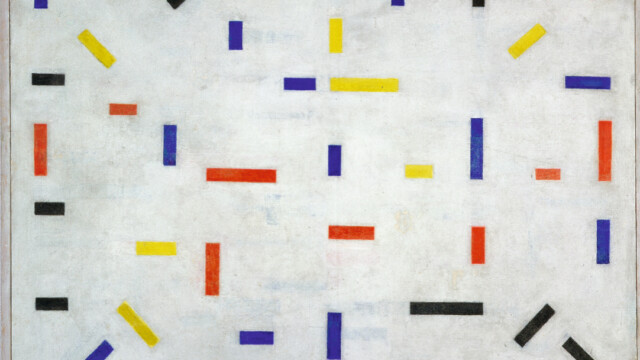 Un 33 tours de Johnny Cash, deux coussins, trois mugs, une trousse… une étagère rassemble, à l’entrée de l’exposition, des objets hétéroclites reprenant les motifs reconnaissables au premier regard des toiles de Piet Mondrian, illustrant leur appropriation par les canons du consumérisme. Après ce clin d’œil, le parcours débute par une plongée dans le néo-plasticisme qui se développe à partir de la revue De Stijl, fondée en 1917 par Theo van Doesburg. Se déploient des huiles emblématiques de Mondrian – géniale Composition avec rouge, noir, bleu et jaune de 1928, où l’harmonie naît d’un subtil jeu d’équilibres / déséquilibres – et de ses contemporains, à l’image de Bart van der Leck. Il métamorphose des motifs figuratifs en abstraction géométrique dans un processus de décomposition-désintégration, comme en témoigne le titre additionnel, Paysage de montagne, ajouté à sa Composition n°7 (1917). Dans ces espaces, se découvrent Marlow Moss – inventrice de la ligne double en 1930, premier écart à la grille traditionnelle du mouvement – ou Gerrit Rietveld dont la magnifique chaise avant-gardiste illustre un credo commun : la volonté de synthétiser tous les arts.