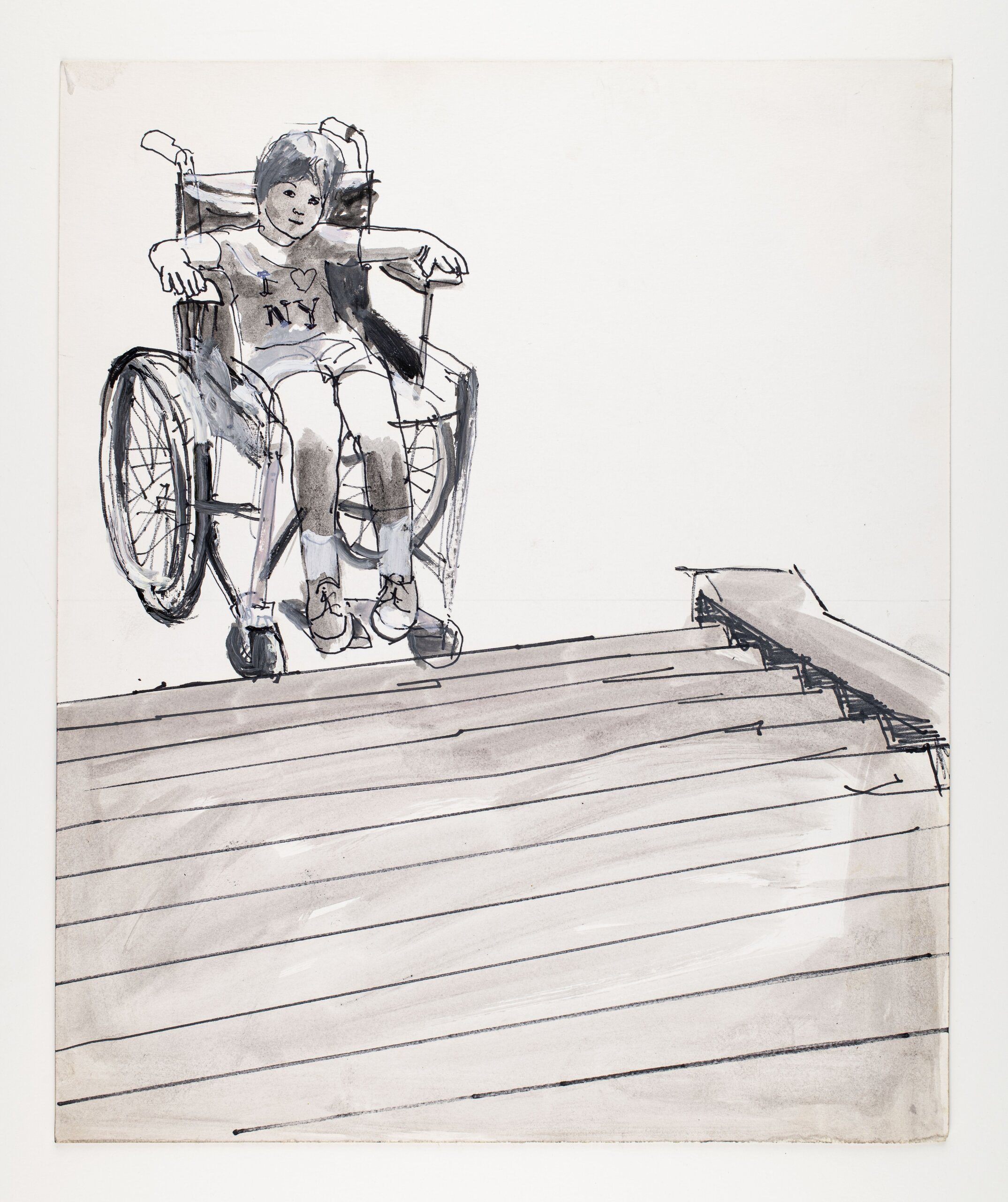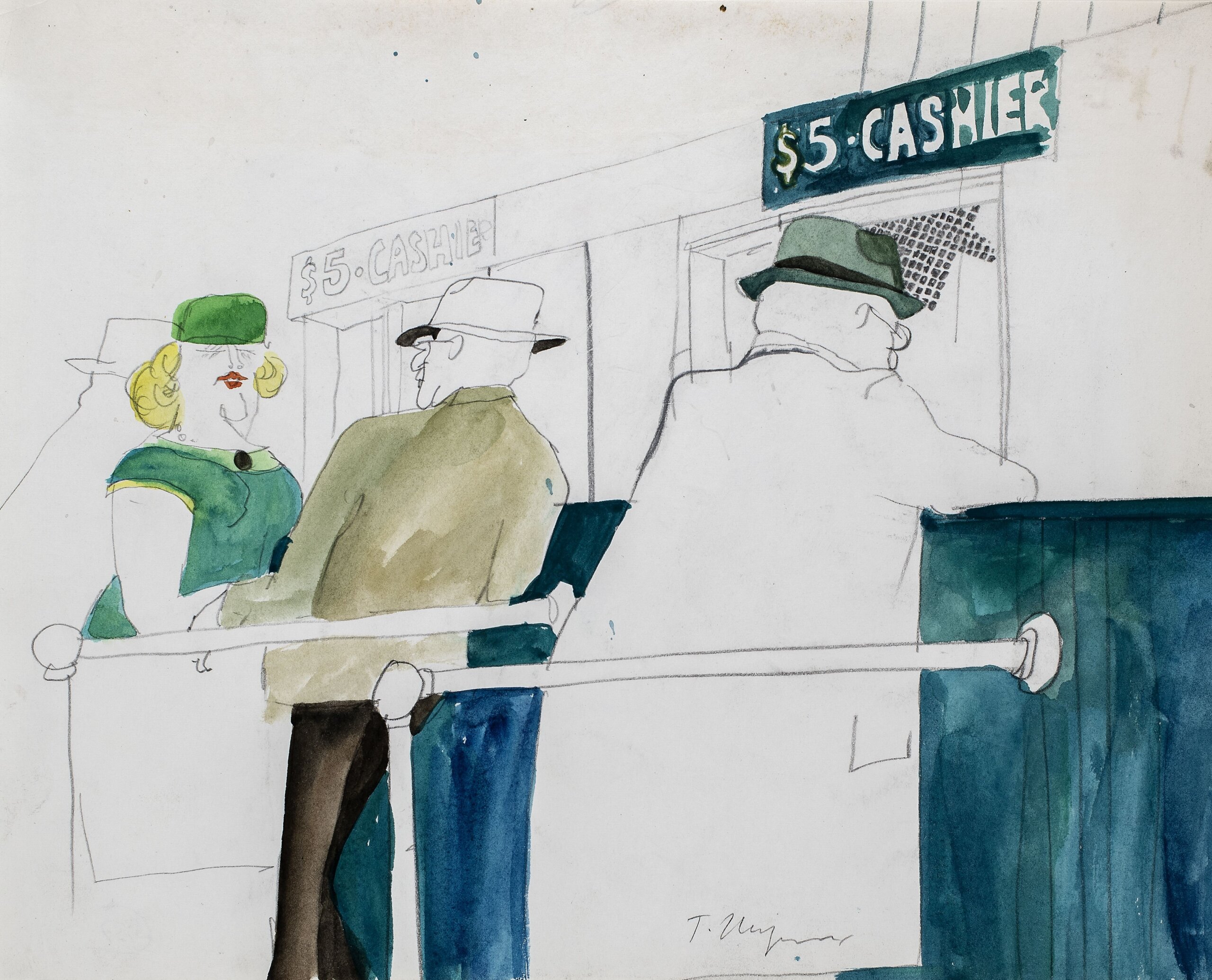 Pionnier du « visual journalism », Robert Weaver (1924-1994) réalisa des reportages dessinés pour des titres comme Esquire, Life ou The New York Times, brossant le portrait de l’Amérique. Qu’il portraiture des oiseaux de nuit ou croque des policiers en intervention, son œil semble capter l’essence du réel : cadrages cinématographiques, angles de vue insolites et importance des détails génèrent des compostions complexes, entre expérience vécue, information et élan artistique. Son regard côtoie celui de Tomi Ungerer (1931-2019), arrivé aux USA en 1956 et influencé par son aîné.