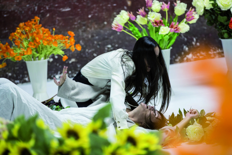 Depuis plusieurs années il ne cesse de le répéter. Le sens de son écriture est de « donner de grands rôles aux femmes ». Consciemment, Pascal Rambert s’attache à renverser le déséquilibre habituel voulant que les dramaturges s’intéressent aux hommes, laissant majoritairement des rôles secondaires à leurs moitiés. Sa dernière pièce creuse un peu plus ce sillon. Actrice est né de longs séjours au Théâtre d’Art de Moscou, l’antre de Stanislavski où triompha Tchekhov. Un lieu gorgé d’histoire, celui du théâtre naturaliste célébrant les grands interprètes. L’auteur et metteur en scène français y a travaillé, interrogeant les membres de la troupe dont certains, octogénaires, jouèrent devant Staline. Ainsi naquit l’envie d’écrire pour ces stars que le tout Moscou vient applaudir et admirer, années après années. L’auteur de Clôture de l’amour et Répétition monte aujourd’hui ce texte en France avec une distribution internationale d’interprètes croisés au gré des pérégrinations de tournées l’ayant conduit au Japon, en Finlande ou encore en Chine. Eugénia, LA grande actrice de son époque, « l’arracheur national de nos larmes », se meurt sur son lit d’hôpital. Un à un, sa famille et ses collègues lui rendent visite comme à une veillée funèbre se déroulant au milieu de 250 bouquets de fleurs.