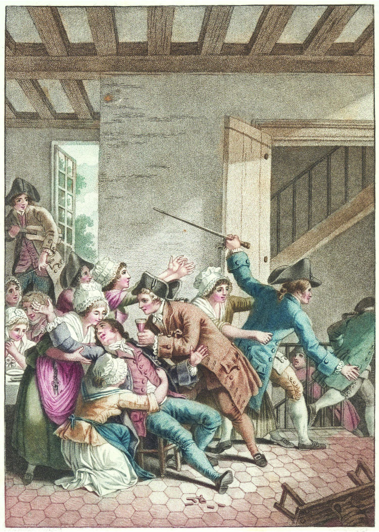Scènes galantes et esthétique rococo forment le substrat d’une élégante exposition. S’y croisent une gravure intitulée Bon Voyage irriguée d’un érotisme diffus, des ornementations décoratives composées de complexes rocailles où s’ébattent putti ou dragons, des scènes tirées des Métamorphoses d’Ovide – Jupiter, perfide, ruse pour séduire la nymphe Callisto – ou encore des animaux, lion s’en allant en guerre chez Jean de La Fontaine et chat coquin qui vient de bondir sur la table d’une cuisine pour y subtiliser de quoi se sustenter. En plein Siècle des Lumières, la satire s’invite souvent dans des gravures illustrant des ouvrages comme Les Voyages de Gulliver de Jonathan Swift ou La Pucelle d’Orléans. Voltaire s’y moque de Louis XV, tournant aussi le catholicisme en dérision : on voit notamment un moine libidineux débarquant aux Enfers et Jeanne partant combattre totalement nue – après qu’on lui eut volé son armure – des Anglais occupés à violer les pensionnaires d’un couvent. Rythmée par de raffinées statuettes de porcelaine, l’exposition ressemble à une réflexion sur les Lumières dans laquelle voisinent scènes officielles – comme un fastueux festin royal qui s’est tenu en 1782, belle image de propagande pour Louis XVI – et images poissardes d’une rixe dans une taverne ouvrière illustrant La Pipe cassée poème de Jean-Joseph Vadé, populaire vers 1750 : deux mondes séparés qui allaient se rencontrer avec violence quelques années plus tard.