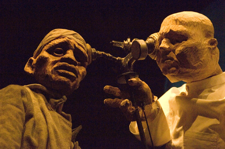 Flottant dans ses fripes, Woyzeck est manipulé à vue comme toutes les autres marionnettes à tiges du spectacle. Le talent des membres du Handspring Puppet resplendit lorsqu’ils évoluent à côté des marionnettes, quittant le mur de planches les dissimulant quand ils sont en dessous d’elles. L’effet “magique” de mouvement des pantins est atténué par la présence, à leur hauteur, des comédiens-manipulateurs. Pourtant, l’expressivité et l’intensité de leur jeu et de leur maniement apportent un supplément d’âme et de sens à l’action : le ballet à trois (une marionnette évoluant grâce à deux acteurs) d’un mineur creusant sur un rythme et des chants africains, le délire du Monsieur Loyal de la pièce qui, armé de son porte-voix, présente un tour de dressage de rhinocéros… Inéluctablement, notre héros torturé perd pied sous le regard malveillant de son médecin qui ne voit en lui qu’un « sujet intéressant » parmi d’autres. Dans une économie de mots, William Kentridge s’appuie sur la force suggestive des images et un phénoménal travail de composition sonore et musicale pour avancer dans l’histoire et pénétrer les ténèbres de l’existence humaine. La pièce de Büchner – inspirée d’un fait divers – retrouve, dans cette adaptation au contexte de l’apartheid, les accents d’authenticité et de fine acuité que l’auteur lui avait conféré. Cruelle ironie de l’Histoire, c’est en plein débat – aussi démagogique que nauséabond – sur “l’identité nationale” orchestré par le gouvernement français que prendront définitivement fin les représentations de cette relecture poignante et engagée de Woyzeck.