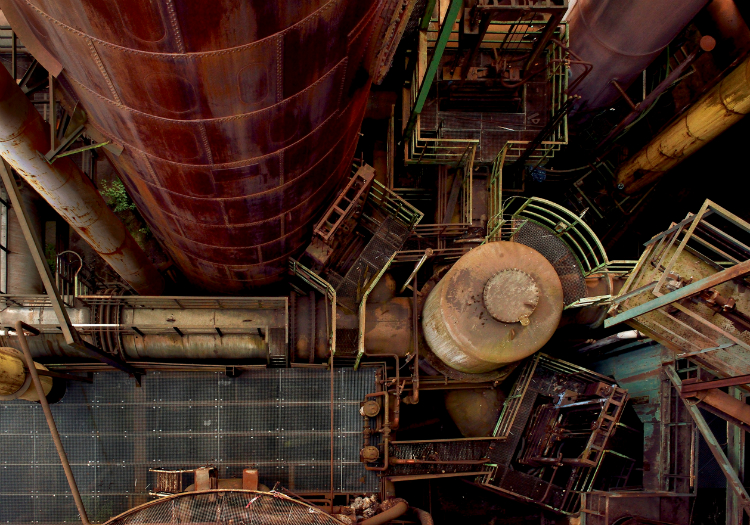 Le photographe aime particulièrement se colleter avec les lignes : deux vues en contre-plongée – un angle qu’il affectionne – juxtaposent le gothique flamboyant d’une cathédrale et la surface lisse d’un gratte-ciel de verre pour une confrontation d’un extrême esthétisme. Une photographie de haut d’une usine qui aurait pu être prise d’un drone, avec ses tuyaux, cuves et autres passerelles de fer évoque autant une toile conceptuelle qu’un voyage dans un monde déserté par l’Homme, une constante dans le travail de Bleyer où l’être humain brille par son absence.