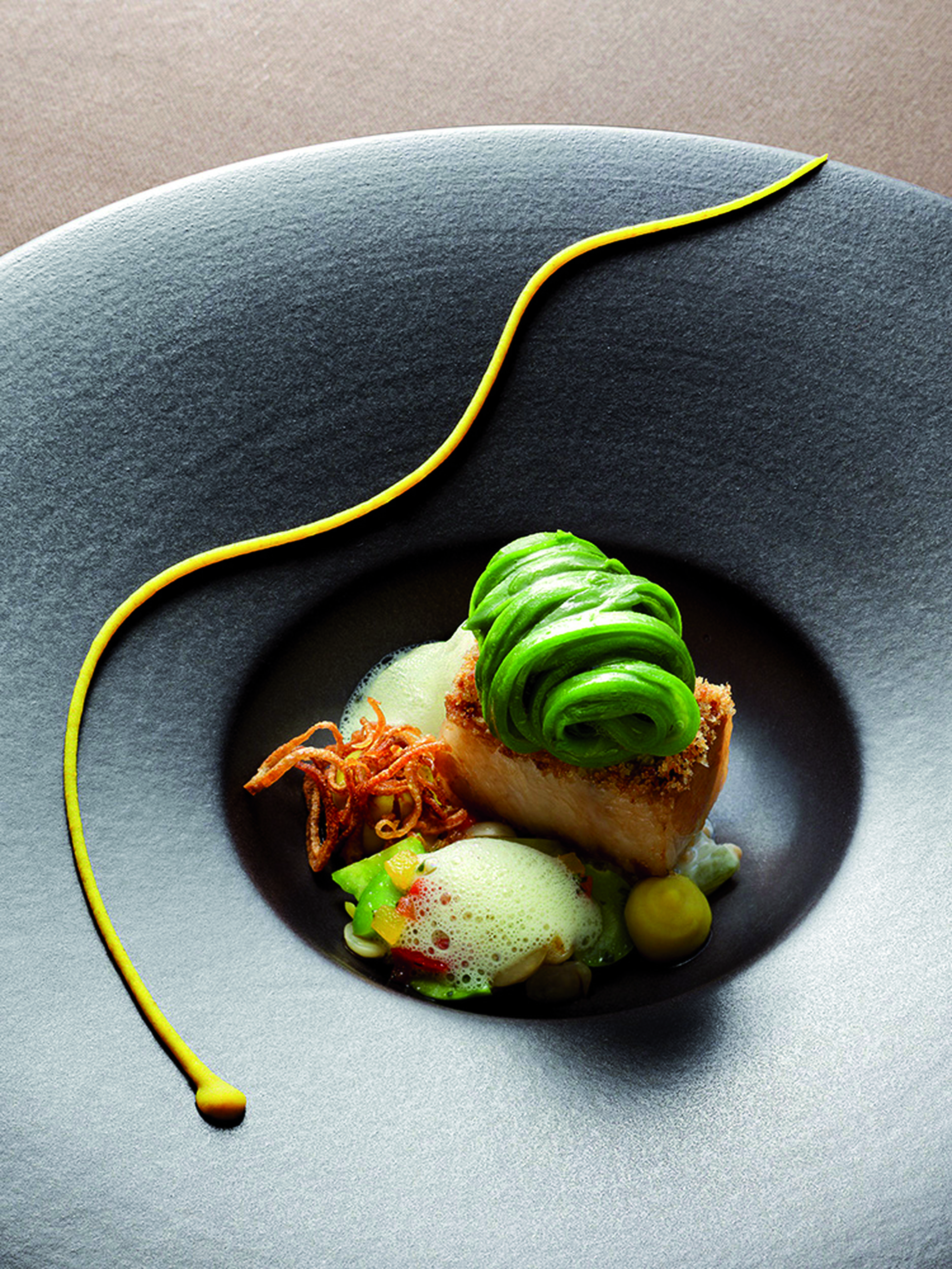 À tout juste 35 ans, Jan Hartwig est passé par les meilleures maisons allemandes, travaillant avec des chefs comme Christian Jürgens, Klaus Erfort1 – il est resté plus de sept ans auprès de lui à Sarrebruck – ou encore Sven Elverfeld. « J’ai bien sûr beaucoup appris d’eux, mais chaque expérience de l’existence est formatrice. Dans la Bundeswehr, je devais cuisiner pour un grand nombre de personnes avec peu. Cela aussi a été très instructif », s’amuse-t-il. Depuis son arrivée en mai 2014 aux commandes d’Atelier, écrin culinaire ultra contemporain signé par le designer Axel Vervoordt – enchâssé dans le luxueux Bayerischer Hof, un des rares palaces encore dans des mains familiales –, son ascension a été fulgurante : deuxième Étoile en 2015, et, suprême consécration, une troisième, il y a quelques semaines. Son credo est simple : « Je cuisine ce que j’aime manger. Impossible, par exemple, de travailler le chou-fleur, un des rares ingrédients qui ne me plait guère.