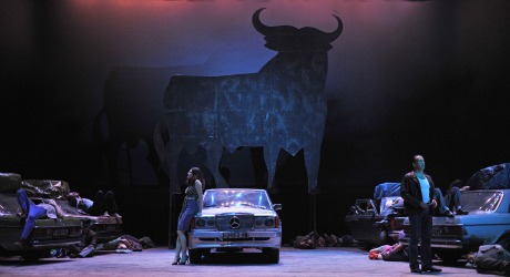 Depuis sa création remarquée à l’hispanique Festival Castell de Peralada, la production de Carmen du metteur en scène catalan Calixto Bieito a tourné dans les plus grands théâtres d’Europe. On la vit récemment à Barcelone avec un couple de rêve, Béatrice Uria-Monzon / Roberto Alagna. La voici à Bâle, dans une nouvelle et harmonieuse distribution et sous la baguette alerte et inspirée de Gabriel Feltz. Sur la scène, pas de décors… ou si peu : une cabine téléphonique, un mât où flotte mollement le drapeau espagnol et une immense silhouette de taureau apparaissant à l’Acte III, décalque parfait du logo de la marque de spiritueux Osborne. L’action se déroule dans un espace temporel flou, quelque part entre la fin des années 1970 et le début des eighties, entre franquisme déclinant et Movida naissante, entre machisme traditionnel et libération sexuelle. Les gitans, eux, semblent tout droit sortis d’un film d’Emir Kusturica avec un look improbable et des Mercedes chargées jusqu’à la gueule de télés de contrebande envahissant la scène.
