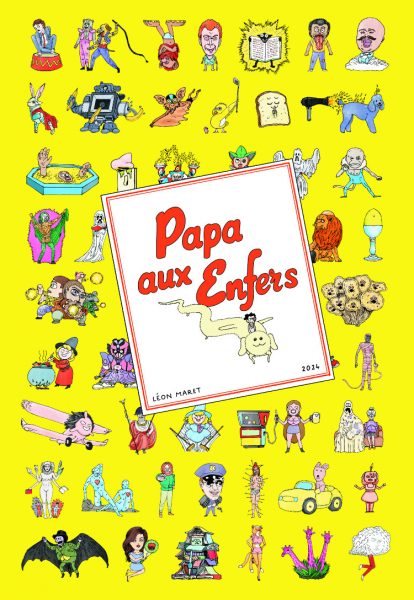 On savait Léon Maret aussi joueur qu’irrévérencieux. Son nouvel album, publié aux éditions strasbourgeoises 2024, ne déroge pas à la règle : un grand format (26x37cm) plongeant Papa aux enfers dans des pages tout bonnement à l’envers, car l’enfer, c’est le monde inversé ! Cette traversée des 11 cercles infernaux à dos de dragon en peluche regorge de promesses loufoques, d’animaux cradingues et de personnages cauchemardesques. Dans ce “cherche et trouve” où les indications les plus improbables mènent vers des « trucs dégueulasses », admet l’auteur-illustrateur, nous voilà « dans la peau d’un dermatologue ou d’un chineur de faits divers, mais en mode fun et pop. » Et l’on prend un vrai plaisir de (sale) gosse à parcourir dans le détail un Atroce Supermarché, une Effroyable Avenue ou une Odieuse Bibliothèque à la recherche d’idées plus farfelues les unes que les autres. Les (grands) enfants se délecteront même à placer bien où il faut les autocollants livrés avec ! (T.F.)