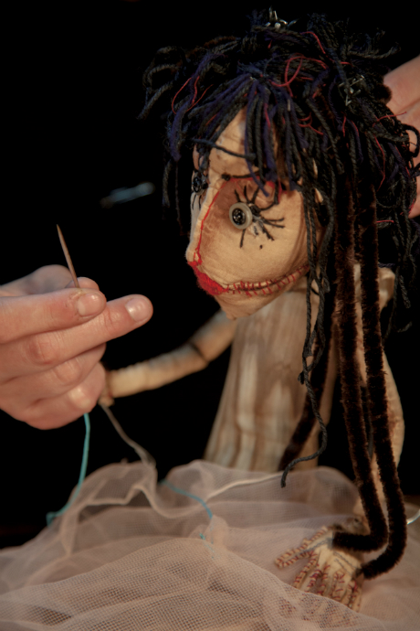 “Filer”, “faire des points” : dans tout le roman, le champ lexical de la couture est exploité et fait écho à la vie. Frasquita recoudra par exemple l’âme d’un homme… L’histoire se déroule dans l’atelier de couture de sa mère, et la scénographie s’en inspire : tous les objets fabriqués et utilisés y sont reliés. Et bien sûr, les marionnettes sont brodées par les précieuses mains d’Alexandra Basquin.