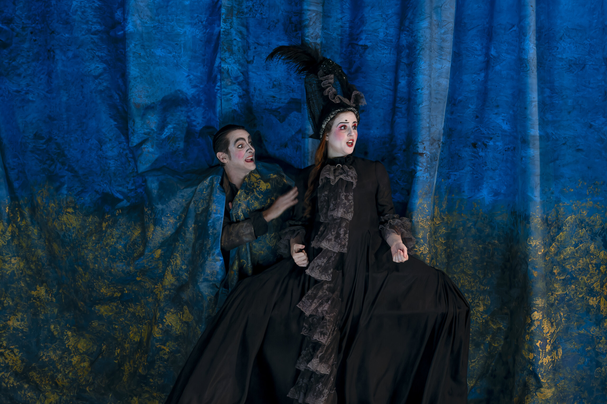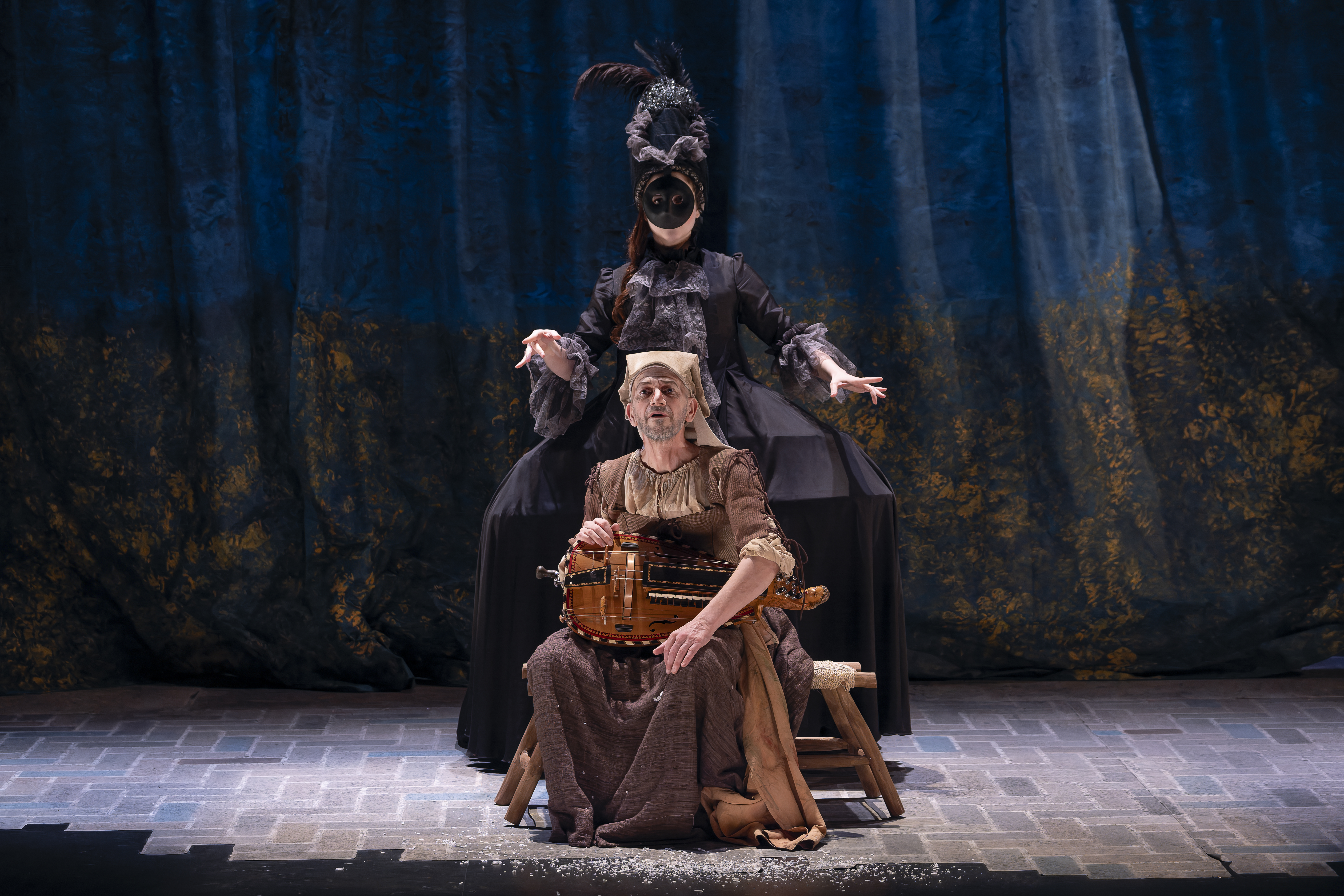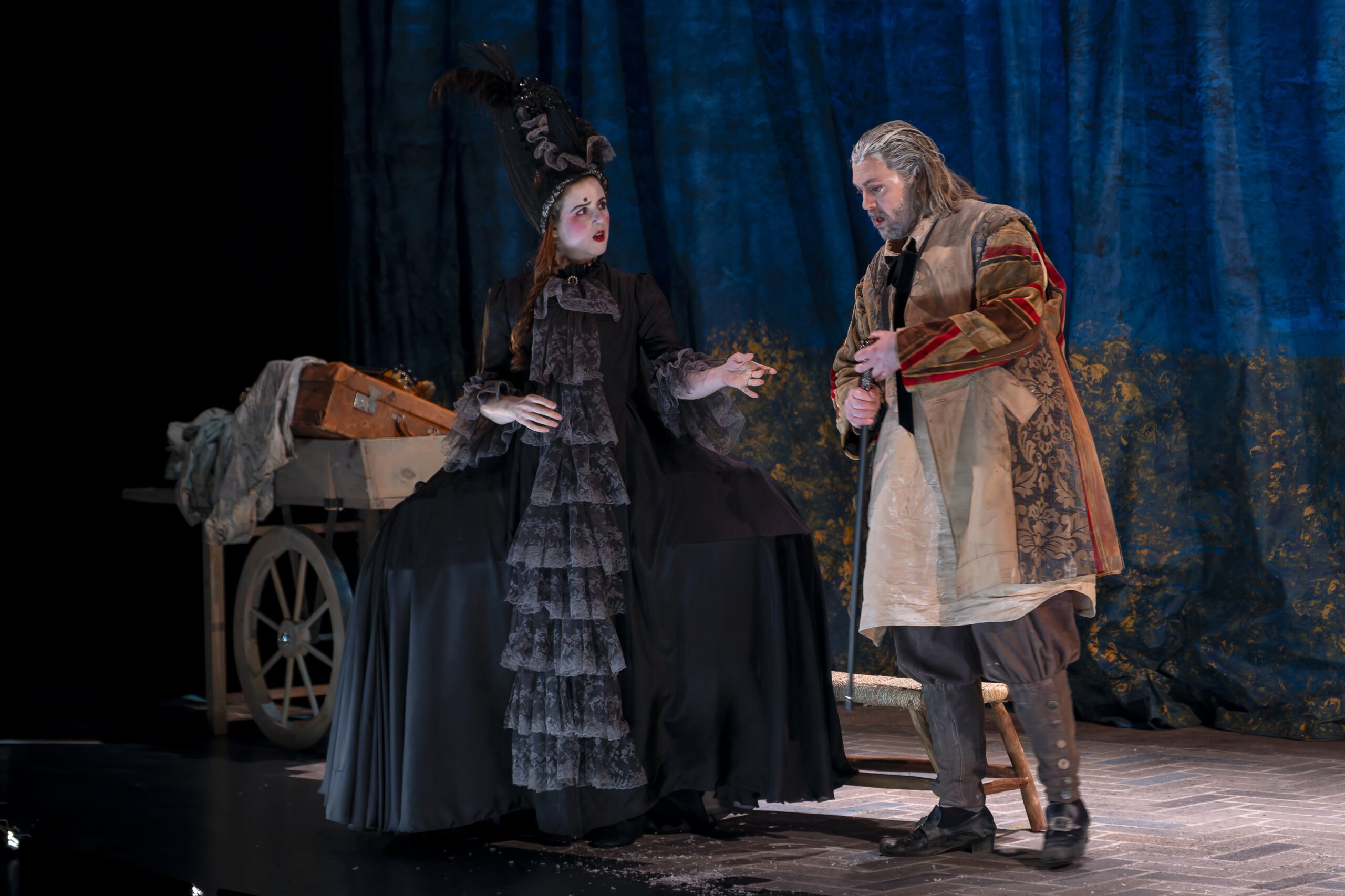 Um ihm sein Gold zu stehlen, das in einer Kassette im Garten vergraben ist, denkt sie sich einen komplexen Plan aus, in dem Verkleidung auf falsche Hochzeiten trifft. In seiner Inszenierung versetzt sich Théophile Gasselin in den Geist der Commedia dell’arte, der das Werk durchzieht, was einem burlesken Epos, der manchmal von düsteren Momenten geprägt ist, einen ganz schönen Rhythmus verleiht, zwischen Gemälden und Kostümen, die ihre Epoche hinterfragen und einem Durcheinander unterschiedlichster Objekte.