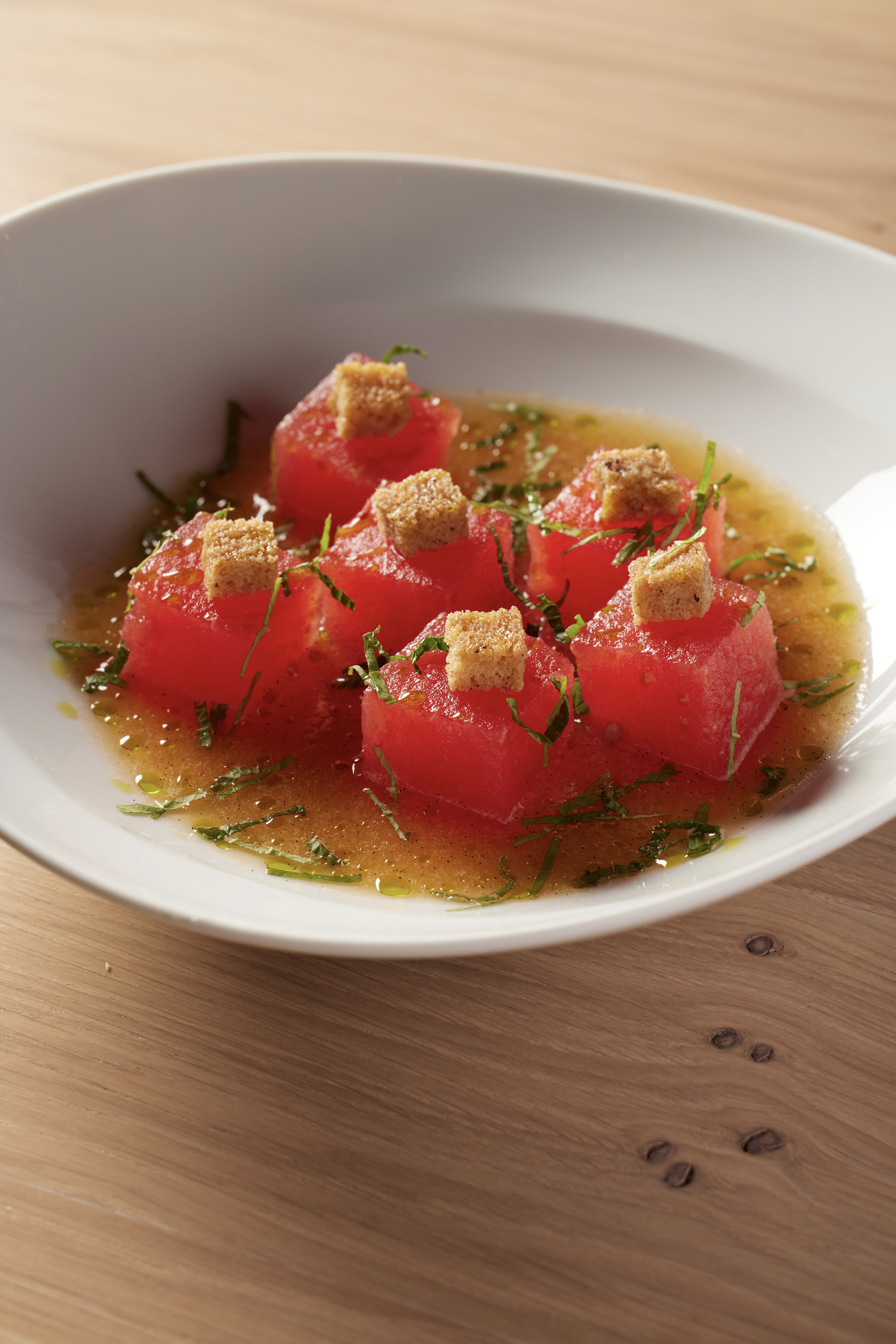 „Meine Küche, das ist der Geschmack des Altüberlieferten mit der Modernität des Anrichtens und des Garens“, fasst Jean-Paul Acker zusammen, der sich einem Spiel der Echos, voller Finesse, mit dem elsässischen Terroir hingibt. Das kann man am „Erfahrungs-Tisch“ schätzen, einer erstaunlichen technologischen Innovation, die eine hypnotisierende Inszenierung bietet, welche es erlaubt zusätzliche Sinneserfahrungen zum Essen hinzuzufügen, aber wir wollen nicht zu viel verraten… In einem höchst ausbalancierten Menu mögen wir einen perfekten Kreis aus siesskass (Quark) vom Hof Richard de Steige, in dem Lamellen von geräucherter Entenbrust und Champignons aus dem Elsass aufeinandertreffen. Unterstrichen von einem starken Confit aus Roter Beete und Pinot Noir, enthüllt diese Op Art-Anordnung starke irdische Geschmacksnoten. Iodhaltiger präsentiert der folgende Gang ein köstliches Klößchen aus blauem Hummer, das am Tisch goldgelb gebraten wird, mit dem Bunsenbrenner, mit seinem orangeroten Rogen (den Eiern des Krustentieres). Klassisch? Sicherlich, aber die Verwendung von Mangold – einem skandalös ungenutzten Gemüse in der Gastronomie, das hier fröhlich zu seinen Ehren kommt – der eine feine geschmackliche Verführung enthüllt, macht das Ganze aufregend, umso mehr als ein saurer Twist erlaubt ist, dank eines sehr subtilen Verjus (vom Weingut Wach in Andlau). Dieser Saft aus unreifen Trauben – „grüner Saft“ im Französischen – der früh verarbeitet wird, stand im Zentrum der mittelalterlichen Küche: Außer Gebrauch gekommen, offenbart er eine schöne Komplexität und überrascht mit Freude.