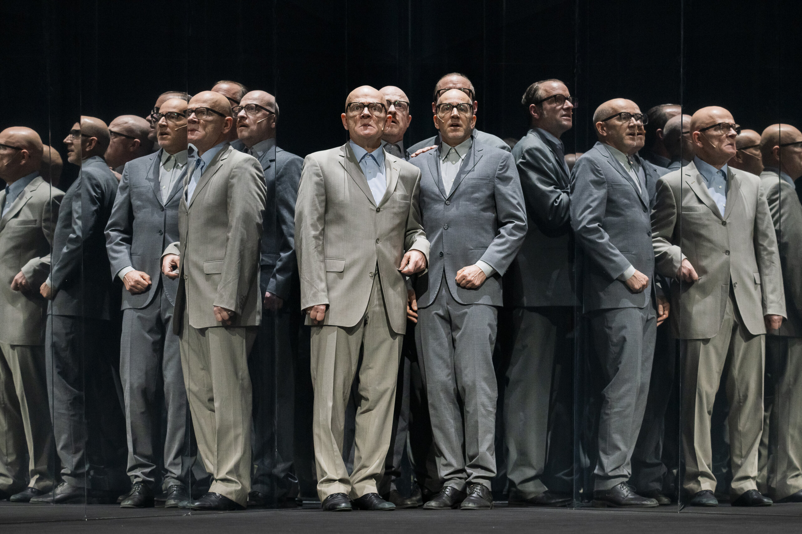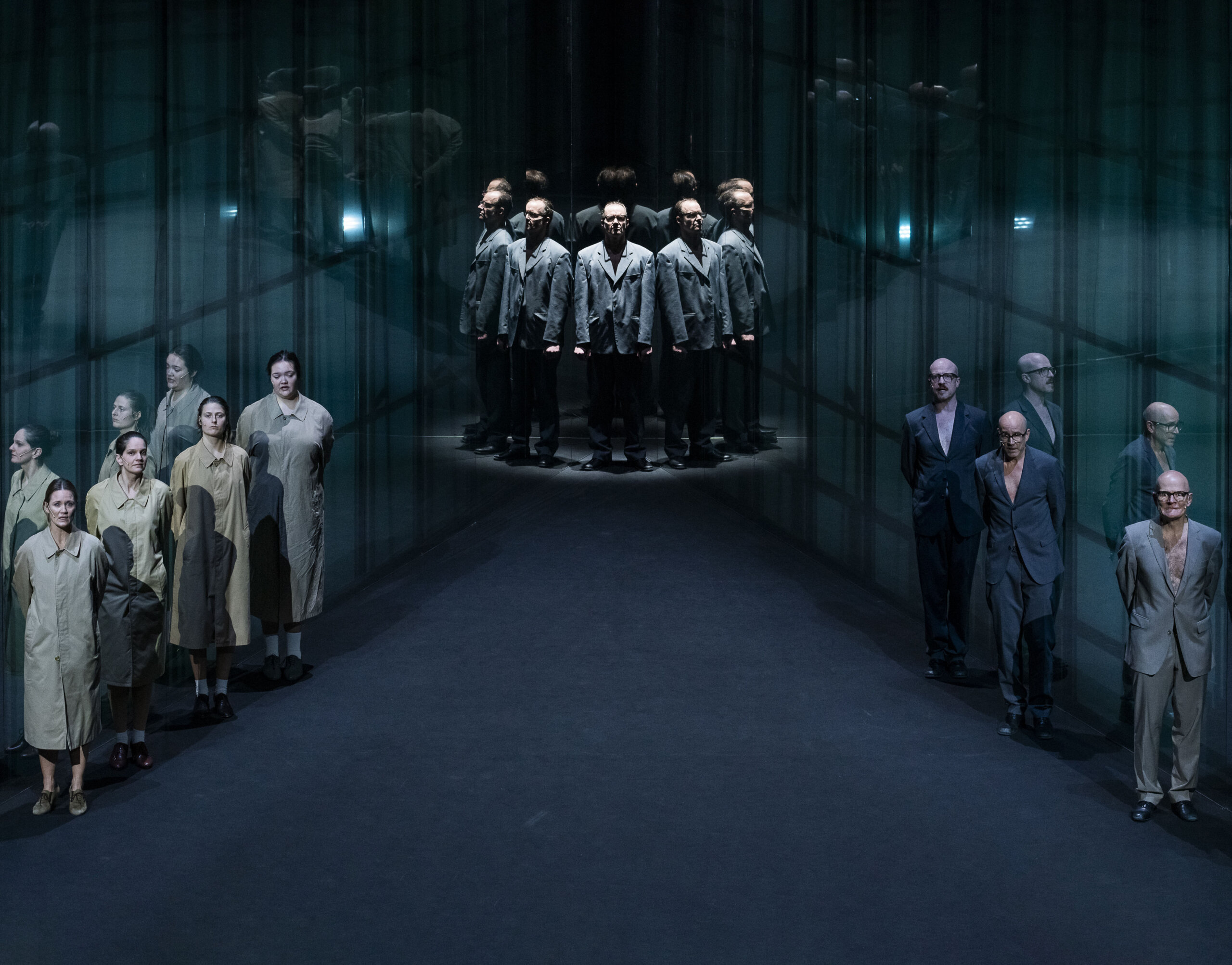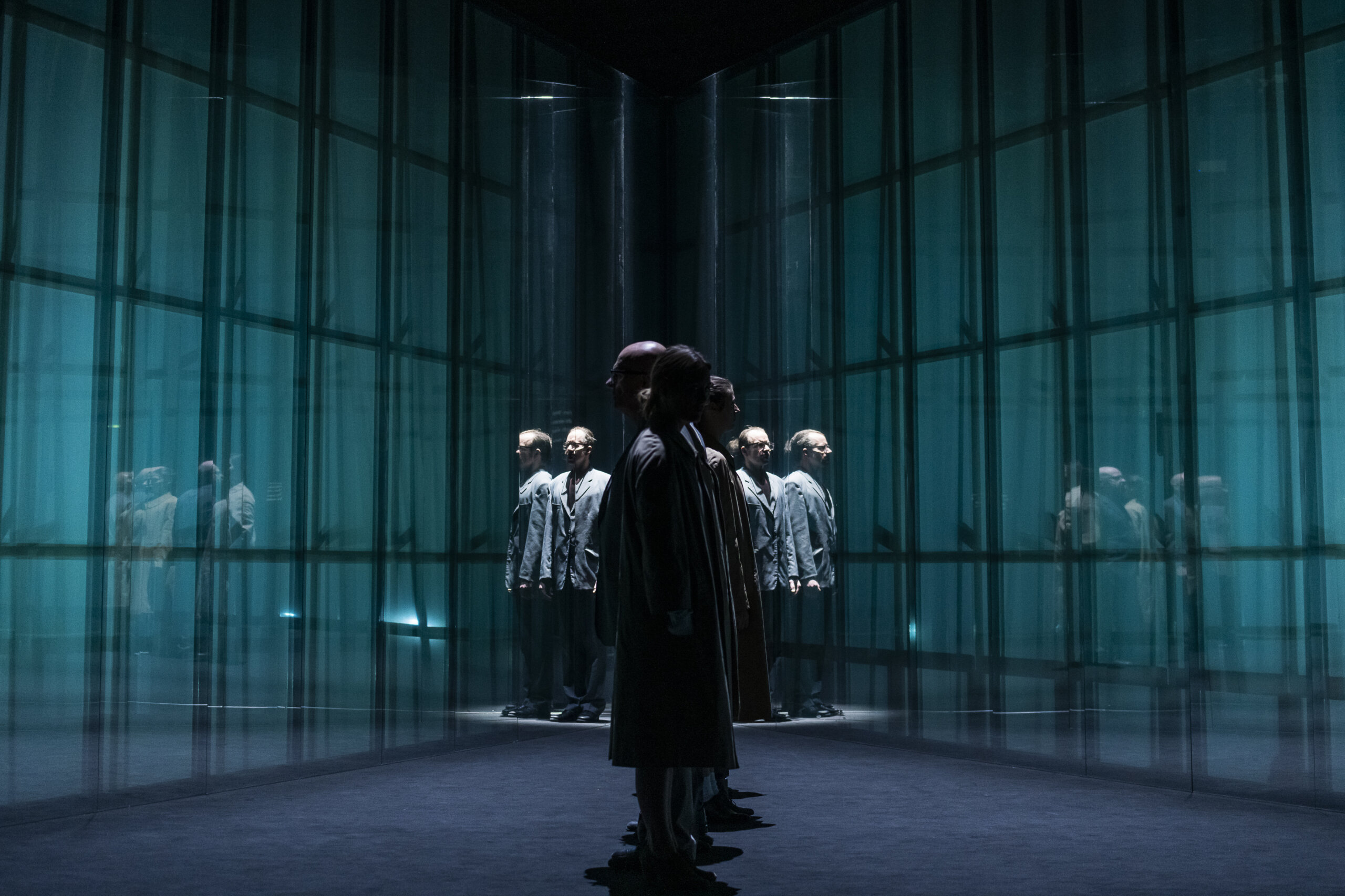 Ein Zahlentausch steht für Zukunftsszenarien der düstersten Art: im 48. Jahr des 20. Jahrhunderts schrieb Orwell seinen Zeitroman über die Erfahrung aus den 40er Jahre und verlegte die Handlung ins 84. Jahr. Drei Großreiche liegen im Dauerkrieg, ihre Bevölkerungen unterliegen der totalen Überwachung – und Propaganda. Die Macht setzt sich in den Köpfen fest, indem sie nicht nur die Zukunft, sondern auch die Vergangenheit bestimmt. Nicht die Gräueltaten allein sind das Erschreckende am Totalitarismus, sagte George Orwell 1944, sondern sein Angriff auf die objektive Wahrheit. Über die Geschichten aus der Geschichte gilt es zu herrschen, will man die Köpfe beherrschen. Und welcher Kopf könnte von sich behaupten, vor diesem Zugriff wirklich gefeit sein? In der Neuübersetzung von Frank Heibert, die als Vorlage für diese Inszenierung dient, geht es um unsere Köpfe. Wenn sich die totalitäre Geschichte darin erst einmal eingenistet hat, braucht es keinen Big Brother mehr. Der Überwachungsstaat auf der Bühne ist eine doppelte, spitz zu laufende Spiegelwand. Winston Smith, der orwellsche Protagonist des Widerstandes, wird gleich von vier Schauspielern in grauen Einheitsanzügen verkörpert. Ihre kahlen Köpfe spiegeln sich wider und wider. Köpfe, wohin man schaut, die doch nur ein einziger sein sollen. Was geht in ihm vor? Die vier Winstons übernehmen die verteilten Rollen des inneren Widerstands, der mal ängstlich, mal wütend, mal mutig, mal verzweifelt um Haltung ringt. Was unmöglich wird, als er erfahren muss, dass sogar die Untergrundorganisation, der er sich angeschlossen hatte, ein Teil des perfiden Systems ist, das alle Aufmerksamkeit auf sich gelenkt sehen will.