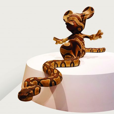 Jeder Form der Anerkennung durch das Milieu der Kunst widerstehend, gegen dessen Elitismus er seit jeher angeht, unterstützt Banksy keine Ausstellung, die seiner Produktion gewidmet ist. Jene in Basel gehört ebenso dazu und vereint rund hundert Werke aus privaten Sammlungen, die zum Großteil Anfang der 2000er Jahre realisiert wurden. Zwei von den drei neueren Werke im Rundgang stammen aus der temporären Installation Dismaland, dem dystopischen Freizeitpark – eine Art Disneyland für Depressive – das der Künstler 2015 in einem kleinen Küstenort in England eröffnete. Der multinationale amerikanische Konzern, Symbol einer oberflächlichen Gesellschaft, ist eine wiederkehrende Zielscheibe des Graffitikünstlers. Seine Skulptur Mickey Snake (2015), die alle Eltern warnt, präsentiert die Maus mit den großen Ohren, die von einer gefährlichen Boa aufgefressen wird, nicht ohne gleichzeitig eine schöne Hommage an den Kleinen Prinzen von Saint-Exupéry darzustellen.