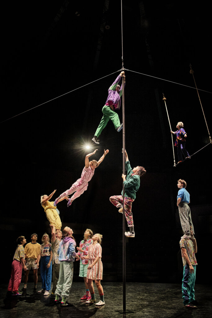 Eine sehr lange Bezeichnung, die auf die Vorliebe des multidisziplinären Künstlers Halory Goerger für Titelei verweist – Es ist zu früh für einen Titel, Zirkusproduktion, die er im Jahr 2016 gemeinsam mit Martin Palisse schrieb – und der, allem Anschein zum Trotz, direkt zur Sache kommt: „Die Tatsache zu inszenieren eine Studienabschluss-Aufführung zu präsentieren, bedeutet sich vorzustellen, was in einem Schüler an dem Tag vorgeht, an dem er sein Diplom erhält“, fasst er zusammen. Von den Studenten des Cnac getragen, die gerade ihre Ausbildung abgeschlossen haben „handelt das Stück gleichzeitig vom Eintreten in die Welt der Arbeit und in den Beruf des Zirkusartisten selbst“, setzt er fort. Nachdem er die Institution studiert hat und den Interpreten begegnet ist, vereint Halory Goerger einige Aspekte ihrer Arbeit – Akrobatik, Accessoires, etc. – mit seiner Praktik des Bühnen-Schreibens, „wo alles nach und nach erfunden wird, jeden Tag, was eine solide Organisation erfordert und einen Hang zur Improvisation“. Die vierzehn Schüler decken ein breites Spektrum von Disziplinen ab – insgesamt acht – vom Gleichgewicht am chinesischen Mast, über Gurte und Akrobatik-Tanz. „Es gibt ebenfalls Text, aber sehr wenig. Ich gehe lieber von der Bewegung aus, konzentriere mich auf die Musikalität indem ich zu den Rhythmen arbeite, den Effekten von Ensembles, Duos, Trios, Gruppenbilder aber auch Solos“, vertraut er uns an. Und er präzisiert: „Auch wenn jeder in seiner Disziplin sichtbar sein muss, gehen alle ein wenig an alles heran, indem sie außerhalb ihrer Spezialität praktizieren.“
