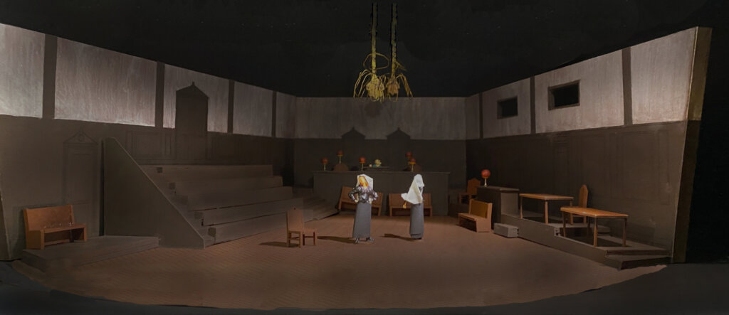 Es ist wichtig, dass in der Außenwelt eine instabile Situation stattfindet. Das muss aber nicht per se die Französische Revolution sein, es kann auch ein Bürgerkrieg von heute sein. Unsere Welt ist gerade so instabil, und ein Blick in die USA oder einen der anderen Staaten, die gerade von kriminellen/faschistoiden Männern gekapert werden, lassen einen ahnen, dass so ein Bürgerkrieg jede Minute möglich ist. Die Nonnen sind immer Nonnen, so auch bei uns. Aber das, was unter dem Habit steckt, und was wir im zweiten Akt dann auch sehen dürfen – wer sind diese Frauen eigentlich gewesen, bevor sie ins Kloster gingen und optisch gleich wurden? – ist interessant. Sie sterben ja auch als Bürgerinnen und nicht als Nonnen. Wir haben das Stück optisch etwas näher an uns herangezogen. Zu Bühne und Kostüme sage ich nur so viel, dass mich die Judikative sehr interessiert hat, die immer noch arbeitet wie ein Krake, dem man den Kopf abgeschlagen hat. Ein Gerichtssaal bleibt immer ein Gerichtssaal, nur die, die Recht oder eben auch Unrecht sprechen, wechseln. Dem Ort ist das egal. Ohne Rechtsprechung gibt es keine Zivilisation. Wenn auf einmal die Verbrecher, die eigentlich vor Gericht gehören, auf der Richterbank sitzen und Justitia nicht mehr blind ist, sondern nur noch Hass regiert, ist Demokratie am Ende. In meiner Heimatstadt Frankfurt steht auf dem Platz vor dem Römer ein Brunnen mit der blinden Justitia. Als Kind habe ich lange nicht verstanden, warum sie blind ist. Ich dachte: Sie muss doch sehr genau hinsehen um Recht zu sprechen. Bis ich verstanden habe, dass Blindheit im Sinne des Rechts Unparteilichkeit symbolisiert – alle sollen gleich sein vor dem Gesetz, unabhängig von ihrer Identität und ihrem sozialen Status. Genau das, was die Französische Revolution gefordert hat: ‚Egalité‘. Aber ganz schnell waren dann manche gleicher als gleich. Und innerhalb von ein paar Jahren wird diese Justiz zur Schreckensherrschaft, sie verdreht sich ins Gegenteil. Die Revolutionäre haben das Wort Humanität vergessen und geglaubt, mit Fraternität wäre das abgegolten, haben dabei aber die Hälfte der Menschheit vergessen: die Frauen. Das Gericht steht nicht mehr für Gerechtigkeit, sondern nur noch für Schrecken. Totalitäre Herrscher haben das schon immer so gemacht. Sie setzen das Recht gegen ihr eigenes Volk ein und nehmen sich selbst aus der Rechtsprechung heraus. So werden sie zu unangreifbaren Personen, siehe Putin, Stalin, Erdoğan, Trump etc. Wer nicht für sie ist, ist gegen sie.
