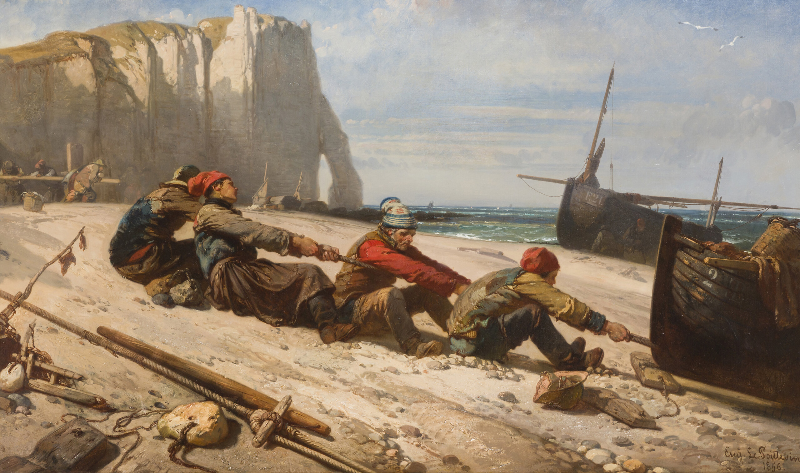 Einige Orte sind dank Künstlern, die sich dort niederließen, in die Geschichte eingegangen. Mit Barbizon oder Pont-Aven, ist Étretat einer der Berühmtesten. Seine Kreidefelsen, die dem Meer milchige Woge verleihen – denen dieser Teil der Küste der Normandie den Spitznamen „Alabasterküste“ verdankt – haben die Maler des 19. Jahrhunderts fasziniert, die unaufhörlich diesen „Felsen mit einer bizarren Form [repräsentierten], abgerundet und mit einem Loch, der ungefähr das Aussehen eines riesigen Elefanten hatte, der seinen Rüssel in die Fluten taucht“, wie es Maupassant beschrieb. Mit rund 170 Ölgemälden, Zeichnungen, Photographien und anderen Dokumenten, zeigt diese Ausstellung wie ein kleines Fischerdorf, das um 1850 zu einem beliebten Seebad wurde – wovon das charmante Seebad in Étretat von Eugène Le Poittevin (1866) zeugt – sich in einen ikonischen Raum des Impressionismus verwandelt hat (aber nicht nur das…). Nach einem immersiven und ergreifenden Eintauchen, das uns buchstäblich vor Ort versetzt, beginnt ein Rundgang in dem sich ein gänzlich Gustave Courbet und seinen „Meereslandschaften“, wie er sie nannte, gewidmeter Raum hervorhebt. Ein im Jahr 1869 beobachteter Sturm ist der Ausgangspunkt für eine Reihe von Wogen, die mit dem Akademismus brechen, in denen er die Kraft der Wellen wie kein anderer vor ihm einfängt, wütende Meereswellen, die sich in engen Bildausschnitten brechen und die die überragende Kraft der Natur unterstreichen.