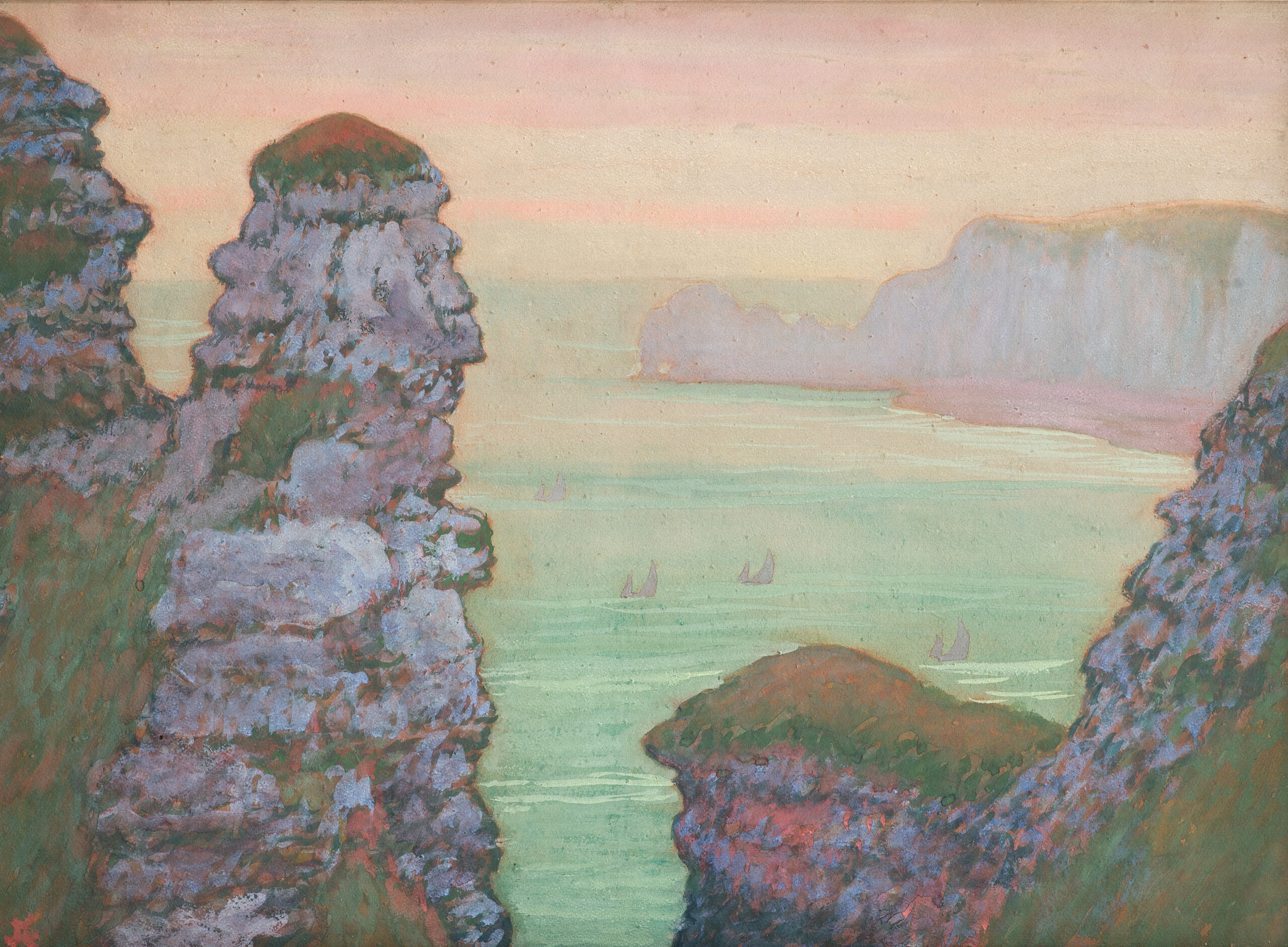 Der Kern der Ausstellung bleibt die Faszination die von Étretat auf Monet ausgeübt wird (von dem nicht weniger als 24 Werke aufgehängt sind), der den Ort 1868 entdeckt. Er kehrt jedes Jahr von 1883 bis 1886 dorthin zurück, malt Serien, die es erlauben die unendlichen Variationen des Lichts einzufangen, das in zarten, sich bewegenden Lichtreflexen mit der Wasseroberfläche spielt und dabei auch die farblichen Metamorphosen der Kreidefelsen je nach Tageszeit und Wetter erkundet. Der Virtuose gibt die Nuancen – bläulich, schmutzigrosa, leicht gräulich, manchmal grün – mit einer unvergleichlichen Feinheit wieder. Das taten auch Eugène Boudin, Felix Vallotton (mit Der 14. Juli in Étretat, 1899), Émile Schuffenecker und seine sich auflösenden Formen, Jean Francis Auburtin, der sich von japanischen Holzschnitten inspirieren lässt, Henri Matisse, etc. Aber keinem ist es gelungen, sich dem Mysterium dieser prächtigen Landschaften mit ebenso viel Anmut anzunähern… was uns an ihre Brüchigkeit erinnert und die Bedrohung, die ein todbringender Massentourismus für sie bedeutet.