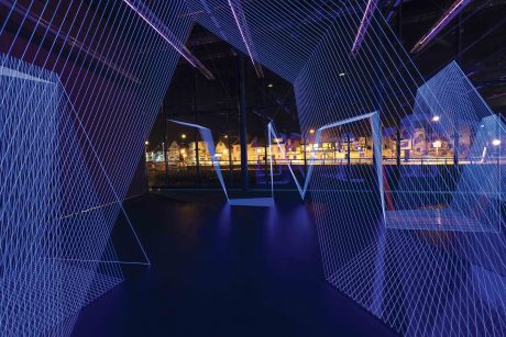 Die koreanische Künstlerin Jeongmoon Choi, die in Berlin lebt und arbeitet, als sich 2011 die Katastrophe von Tohoku ereignet – das Erdbeben verursacht einen Tsunami und den atomaren Unfall von Fukushima – verleiht ihr Leben, indem sie im Raum des Frac Alsace im Rahmen ihrer ersten institutionellen Ausstellung in Frankreich „die Bewegungen und Vibrationen der Erde zeichnet“. Wie für ihre Installationen vor Ort, Architektur aus Wollfäden und Licht, hat die Bildhauerin, die Malerei studiert hat, „das Bedürfnis dreidimensionale Räume zu zeichnen.“ Sie fügt hinzu: „Warum der Faden? Für den handwerklichen Kontakt zwischen meiner Hand und dem Material. Er webt den Raum, unterteilt ihn und beinhaltet diesen Begriff des Maßes, der in der Architektur präsent ist.“ Le Pouls de la Terre verkörpert gleichzeitig das Seismogramm der Katastrophe und eine zerbrechliche Konstruktion, durch die sich der Besucher bewegt um sich so gewissermaßen das Erdbeben anzueignen. Mal bunt, mal leuchtend, deklinieren sich diese weitverzweigten Fäden, die man nicht ganz durchschreiten kann, in zwei Blickspiele. „Jene auf den Wänden, gelb und vertikal, repräsentieren die Höhen der Richterskala. Sie sind die Projektion eines Negativauszugs des Seismogramms von Tohoku“, erklärt die Künstlerin. Die weißen Fäden, im Zentrum des gläsernen Raums, stellen die Katastrophe dar. Zwischen monströser Verkörperung der wissenschaftlichen Skala, Volumen aus gespannten Fäden und geologischer Aufteilung der tektonischen Platten, zeigen sie eine lebendige Erde, im Relief, gleichzeitig gefährlich und verletzlich.