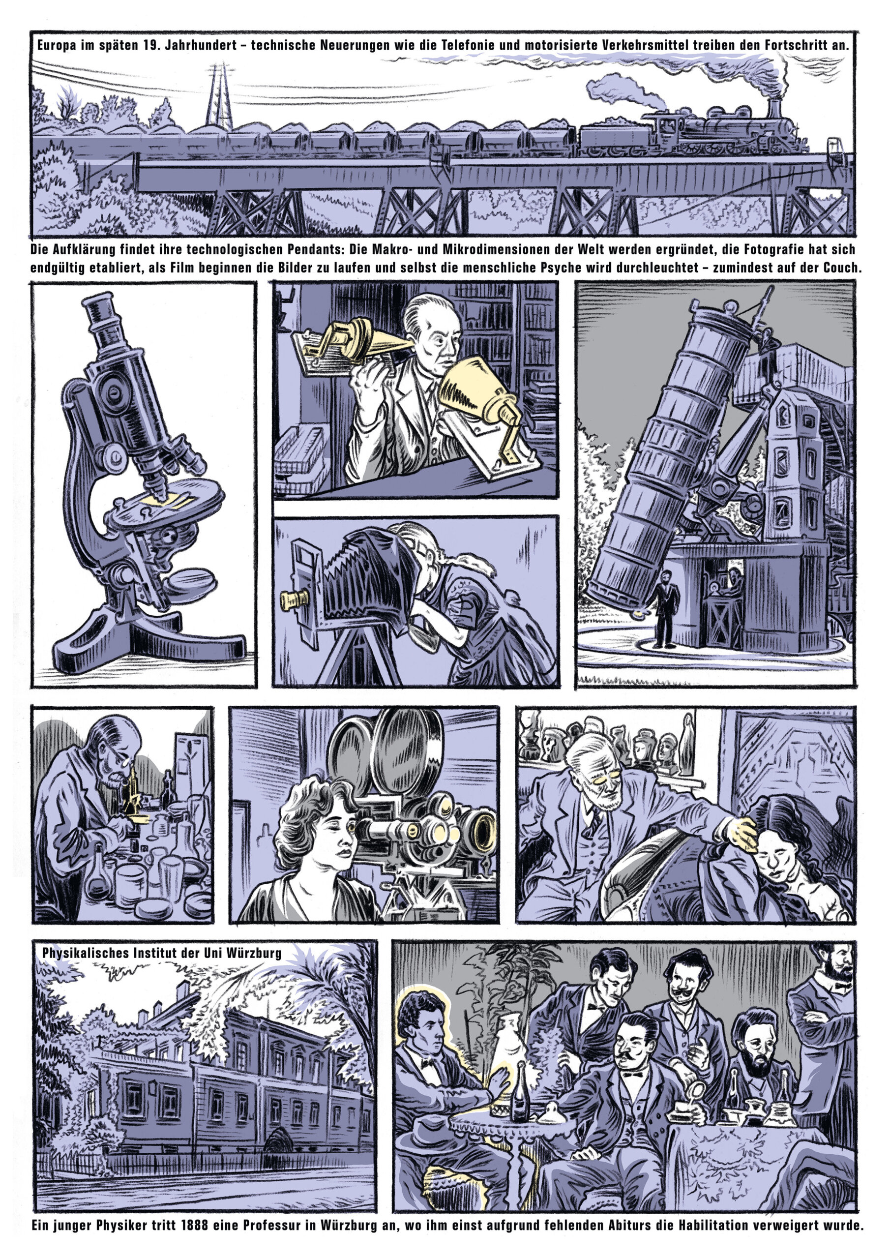 Der vergangenen 8. November war ein symbolisches Datum: Die Entdeckung der X-Strahlen, vor 130 Jahren, durch den deutschen Physiker Wilhelm Conrad Röntgen. Im Inneren der beeindruckenden Industriestätte Völklinger Hütte – in der Gebläse-und Verdichterhalle – decken 79 Akteure aus der ganzen Welt verschiedene künstlerische und wissenschaftliche Felder ab, die zu einer ergreifenden Reise durch die Geschichte dieser elektromagnetischen Strahlen und ihren Einfluss auf die Welt der Kultur einladen. 18 Kapitel erkunden den Platz der Radiologie im Laufe der Zeit und laden den Besucher dazu ein in einen Rundgang einzutauchen, der unter anderem mit einer Abfolge von Zeichnungen beginnt, die speziell für die Ausstellung kreiert wurden. In The X-Ray Story, enthüllt Jens Harder – dem man das vor Kurzem erschienene anspruchsvolle Gamma (Carlsen Verlag, 2025) verdankt – so in Form eines Comics die Entstehung dieser Revolution. Darauf folgt eine Rekonstruktion des Labors von Röntgen in einer intimen Inszenierung, in der man das wertvolle Zeug dieses genialen Geistes sehen kann.