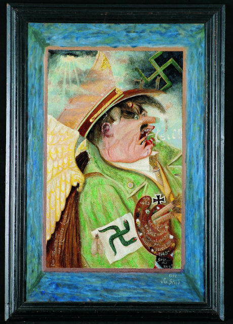 Certains partent en exil, d’autres se réfugient dans la clandestinité, les derniers se compromettent, mettant leur art au service de la Révolution nationale et produisant des œuvres mièvres… Les affaires continuent en effet à Paris : Breker est exposé à L’Orangerie en 1942, année où ouvre le Musée national d’Art moderne (dans le Palais de Tokyo) dont sont soigneusement écartés abstraits et surréalistes… Dans ce panorama complexe, émerge une figure originale, celle de Joseph Steib (1898-1966). Employé au service des Eaux à la Ville de Mulhouse jusqu’au début des années 1940, cet autodidacte – admirateur de l’œuvre de Zwiller – va peindre, dans la clandestinité de sa cuisine de Brunstatt, d’étranges tableaux ici regroupés sous le titre (que lui donna l’artiste lui-même) de Salon des rêves… Évoquant les ex-votos naïfs, ses tableaux sont une charge violente contre les nazis : Hitler représenté en Antéchrist entouré de ses sbires maléfiques, le Führer pendu alors que l’Alsace retrouve la France… Entre violence, art populaire et références (à Arcimboldo) voilà des œuvres étonnantes, sans doute les plus marquantes de l’exposition.
