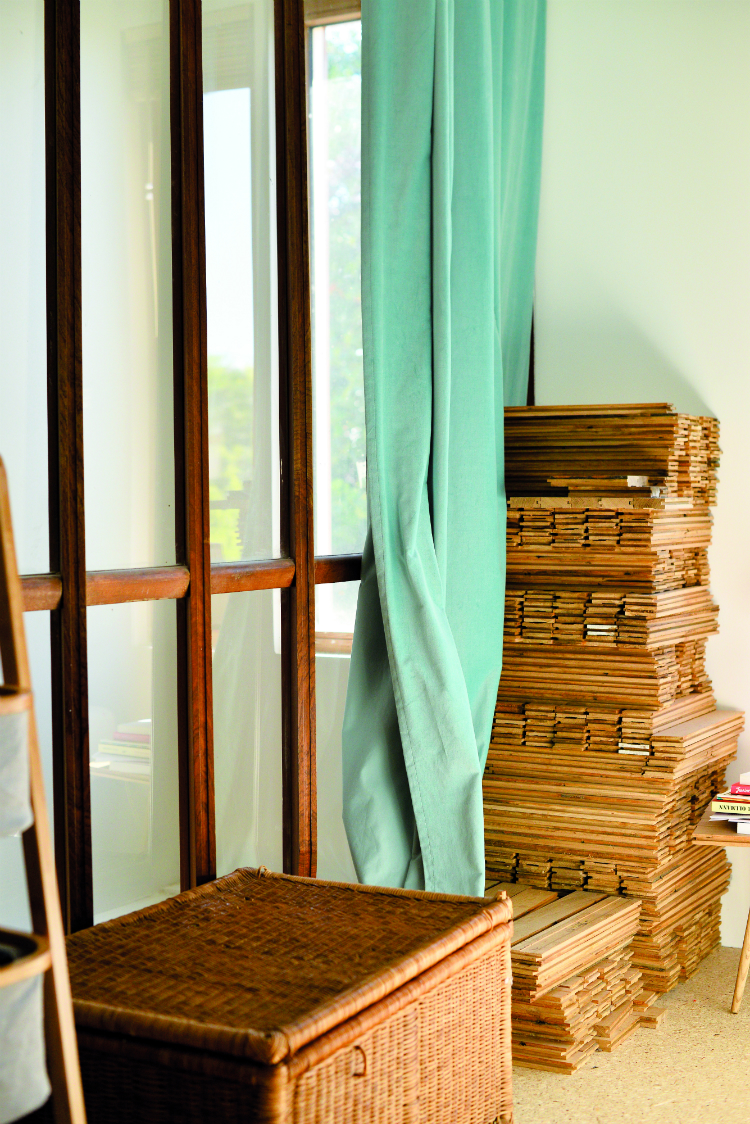 2 / Le matériau roi est le bois, à nu ou recouvert d’un enduit. Dans les pièces, au sol ou au plafond, aux murs ou même sur la paroi des meubles, Sonia a fait installer des panneaux de copeaux de bois agglomérés qui donnent un aspect brut au lieu. Le chantier a nécessité l’intervention de deux équipes de charpentiers : Cheher Wood (Phalsbourg) et Natur’Elément Bois (Saint-Louis).