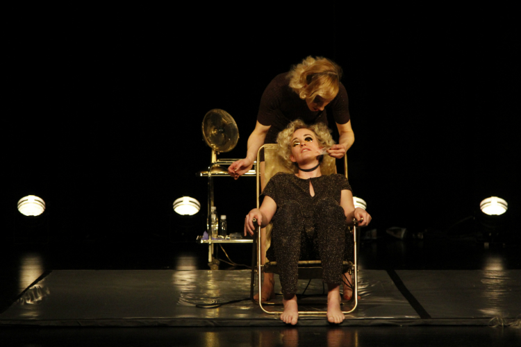 L’entreprise performative de déconstruction de Forced Beauty broie les images parfaites, abîme avec méthode tout ce qui est propre et lisse, explore le plaisir de la douleur, celui de la provoquer comme de la subir dans un jeu de miroir pervers et ambigu. Entre désir et domination, soumission corde au cou et érotisme cru, leur corps à corps passe par la danse de couple pour lancer une bataille où chacune s’arc-boute pour prendre le dessus, se cherche, s’attire, s’accroche… La sensualité d’un baiser jamais advenu tourne les têtes. Croquer dans une branche de céleri fait se tendre le corps de sa moitié, siroter langoureusement un jus de tomate entretient l’envie d’une possession comme la chimère d’un pouvoir sur ses émotions. Se jouant de nous, les performeuses n’oublient guère longtemps de détourner les images créées devant la caméra portée au poing par l’une. Le jus visqueux répandu sur le visage et le décolleté de l’autre, s’il est plus que suggestif, n’entraîne qu’un peu plus de tension. L’hyper sonorisation du plateau trouble les perceptions sensorielles. Inversion des rôles dominant-dominé, les simulacres laissent parfois place à de vraies claques avant d’aboutir à un énième cliché (dé)joué, de cases envoyées valdinguer à côté de leurs préjugés : corps huilés pour un affrontement exagérément ralenti de catch en petite tenue précédent une joute verbale montrant que les deux blondes n’ont rien à envier à la gouaille injurieuse et trash des plus beaux spécimens d’Homo sapiens sapiens ayant traversé le temps.