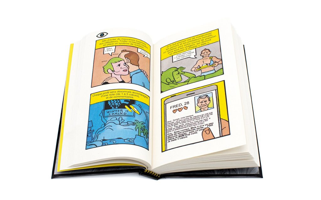Déjà remarqué avec TOONZIE, son double gourou, voilà que les éditions strasbourgeoises 2024 publient un recueil des prédictions de Xavier Bouyssou dans le bien nommé Livre Oracle. Des récits en dix cases carrées (type Instagram) dans un petit format en hauteur séduisant en diable. Récits ciselés et dessin épuré, le bougre nous convie dans ses prophéties futuristiques en pastichant notre présent pour mieux l’éclairer. Alors que les mythes anciens ont été oubliés (remplacés par une récupération bobo du hip-hop et des grands ensembles tout en parlant vieux françois, summum de la hype), le néo âge de pierre qui nous guette est peuplé d’Hommes-Rêves qui content des jeux vidéo du tournant du XXIe siècle, sans jamais y avoir joué. Dans une société anarchiste de droite glorifiant les skills personnelles ! Les techno-rêves dictent nos nuits avec leur pub et les appli de rencontre continuent de régir nos vies. Des lentilles de contact LCD diffusent des émojis reliés à nos sentiments, s’assurant du consentement lors de chaque date. Demain c’est loin. Heureusement !