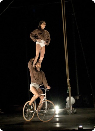 Le comique et l’absurde des situations qui se succèdent feraient presque oublier la virtuosité des corps. Presque seulement. Leur réflexion sur l’échec dans un duo d’acrobaties main à main, où ils multiplient les figures impossibles les faisant s’écrouler, symbolise cette auto-dérision permanente qui n’a d’égale que leurs impressionnantes prouesses physiques. Chez eux, la gymnastique matinale prend la forme de poses imitant les statues à la gloire d’images révolutionnaires. Et lorsqu’ils dénoncent « la voiture comme moyen de transport individualiste et polluant », ils usent de prouesses sur vélo pour rallier les citoyens-public aux beautés de leur cause. Le couple d’acrobates reste totalement sourd aux slogans (« Trouve-toi un travail ! », « Montre tes nichons ! », « Achète une bagnole »…), s’échappant du mégaphone installé sur une voiture téléguidée les poursuivant, vous l’aurez compris, en vain.