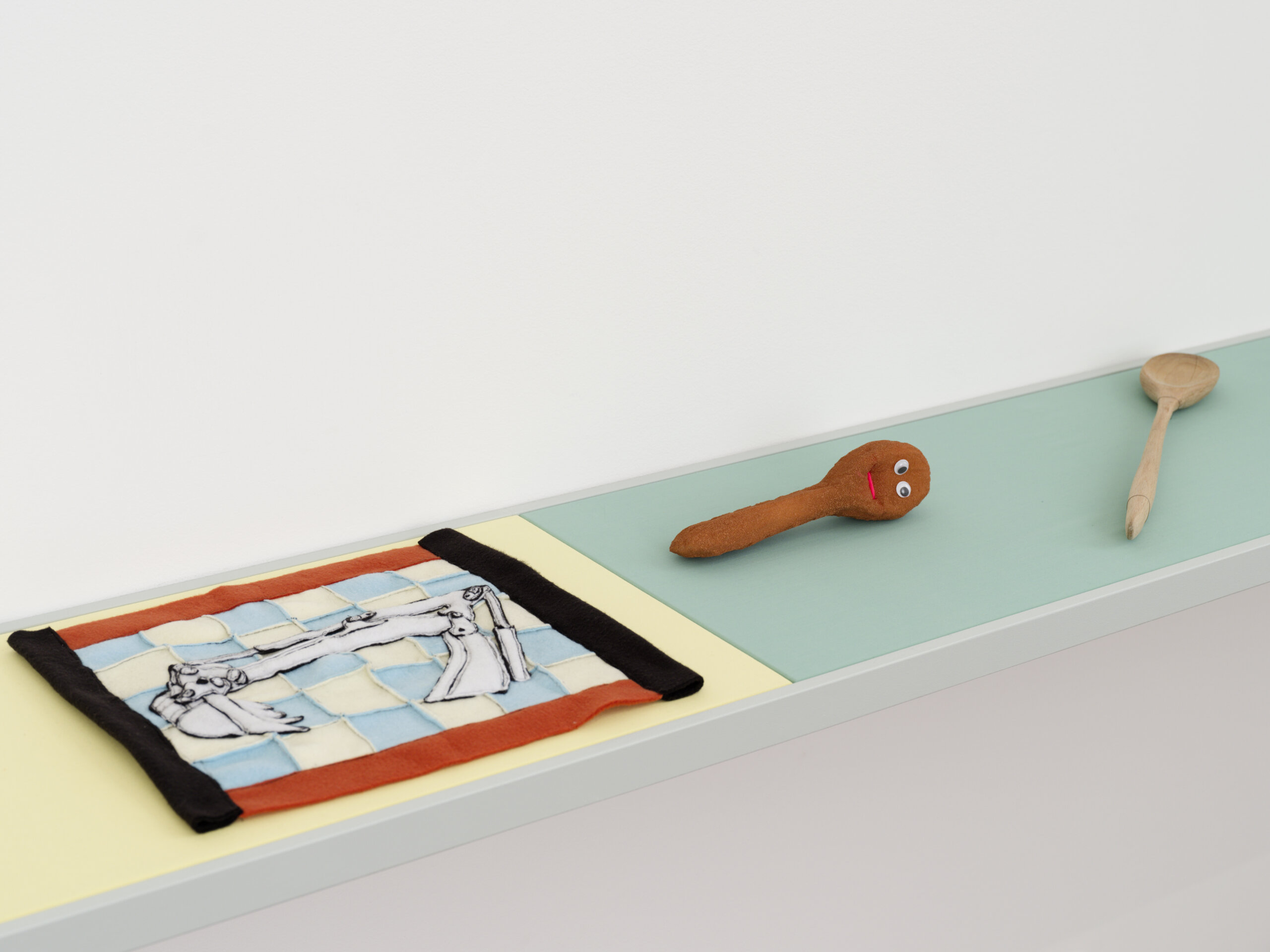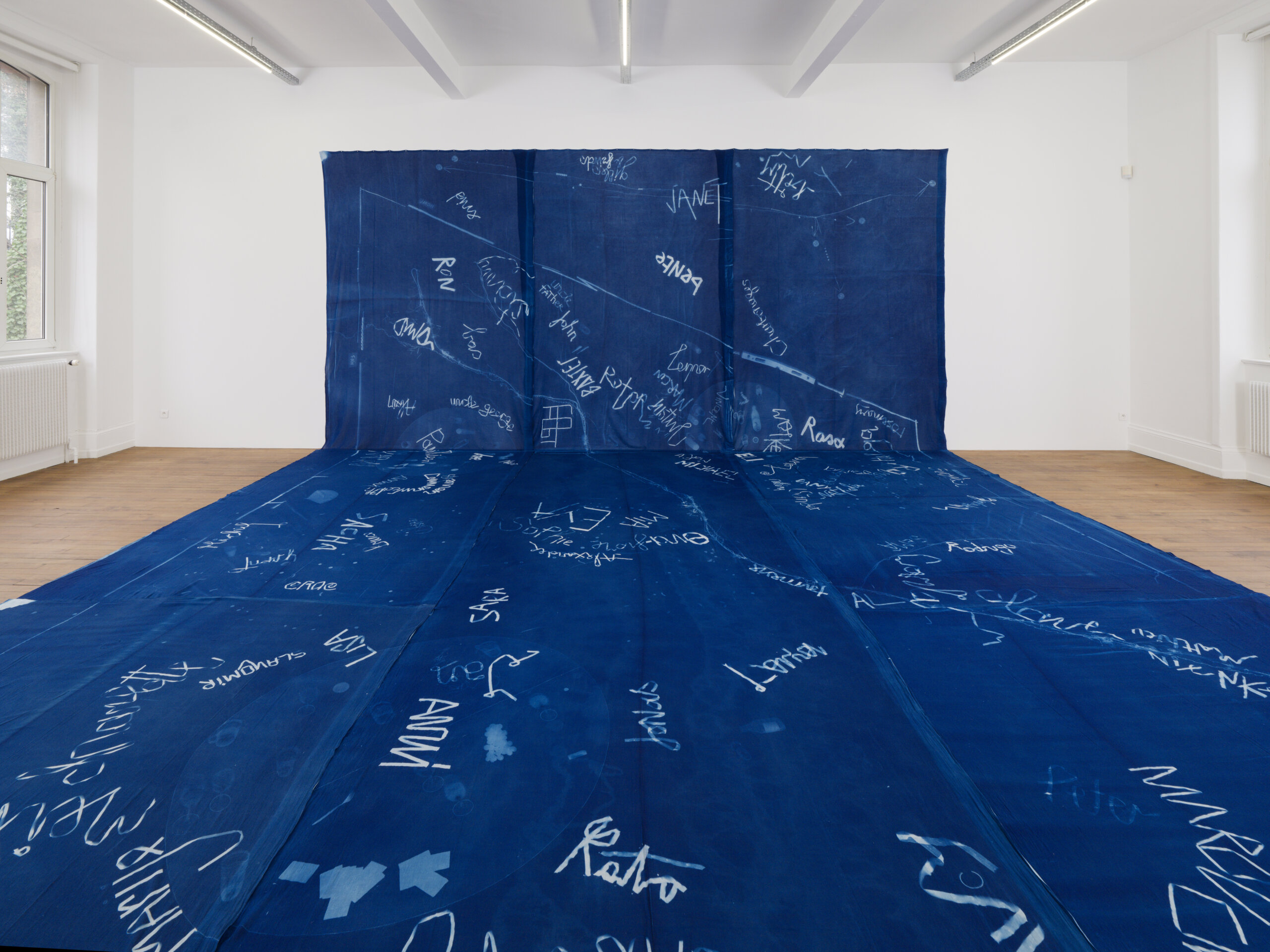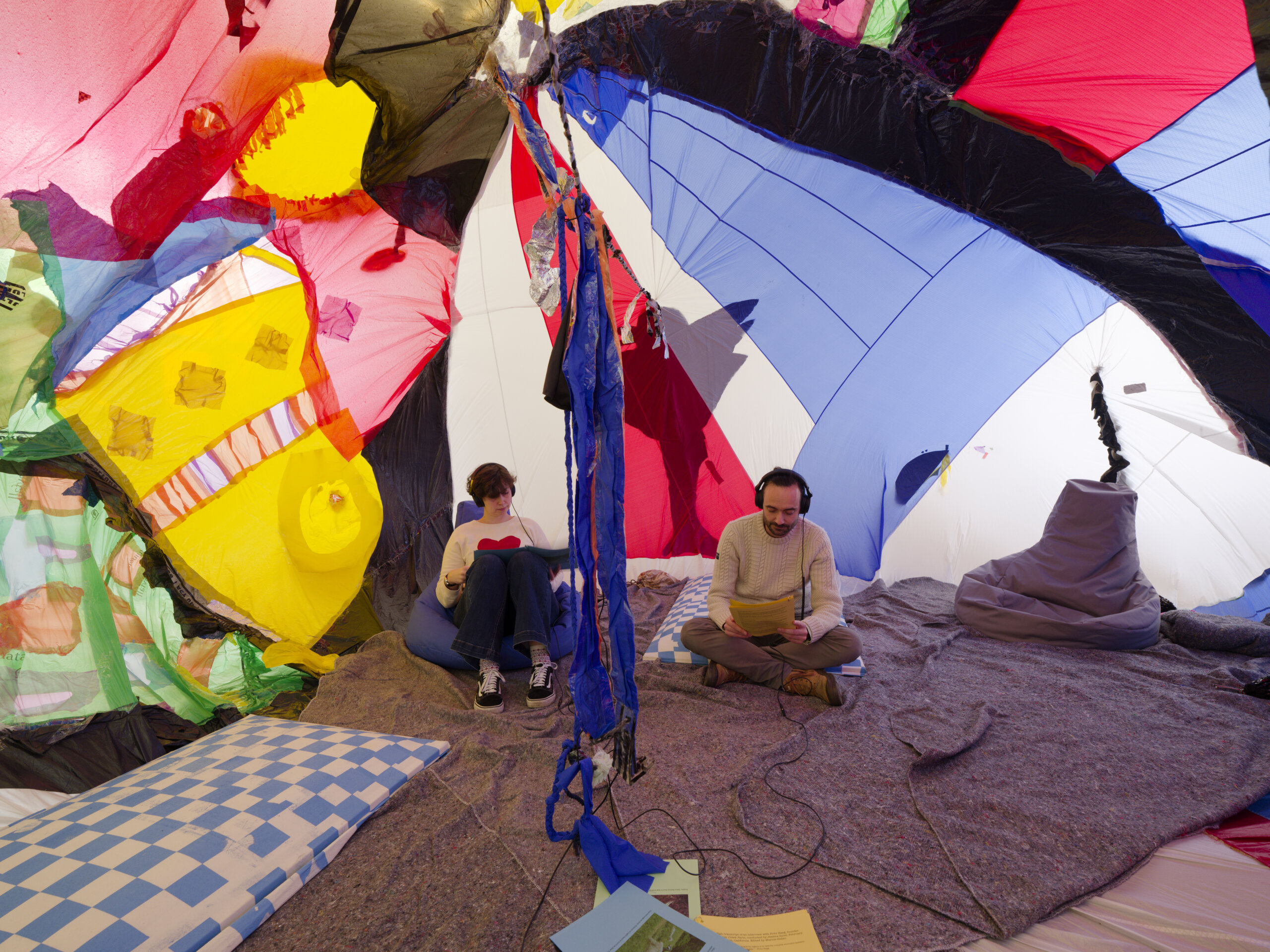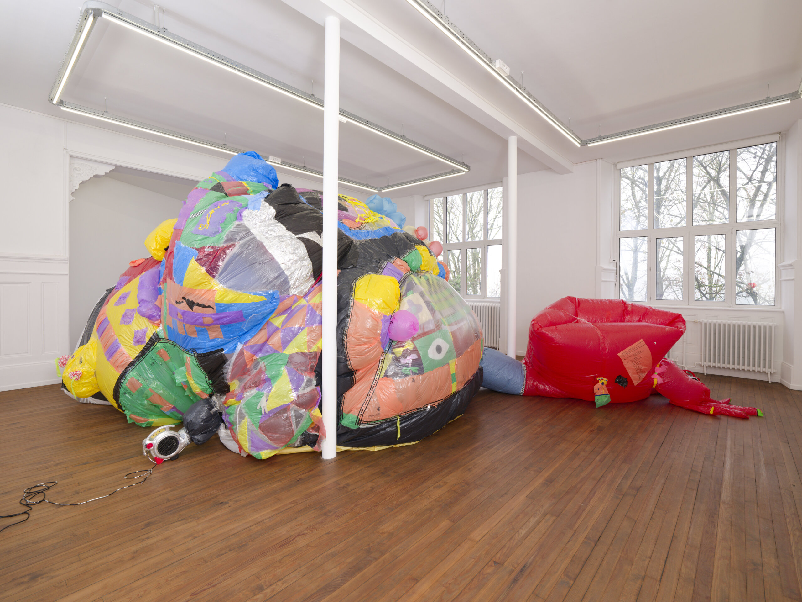À l’Amitié (2024), portail pour l’entrée du jardin du Crac, est le point de départ symbolique de cette exposition où les plasticiens, éditeurs et enseignants installés 15 rue Heyvaert, dans la capitale belge – lieu de vie, de création et de travail partagés –, investissent l’institution alsacienne. Ils y célèbrent les amours-amitiés queer dans de multiples et joyeuses allégories, comme cette Common Room (2025), reflet d’une existence engagée forte de bienveillance. Ils ont aussi convié des compagnons de route, à l’image du collectif MYCKET, avec son Dream Castle (2016-18) : structure gonflable en matériaux recyclés, cette architecture-cocon apaisée rappelle curieusement les sculptures voluptueuses de Niki de Saint Phalle.