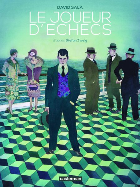 Sur un paquebot voguant en direction de l’Argentine, Mirko Czentović, grand maître des échecs, affronte un mystérieux joueur, Monsieur B. En Autriche, ce dernier avait été enfermé par les nazis, n’ayant à sa disposition, pour se distraite de la solitude, qu’un livre rassemblant de mythiques parties d’échecs qui l’a sauvé… et entraîné aux limites de la folie. Véritables tableaux, les planches de David Sala sont pleines de « réminiscences d’inspirations [qu’il] traîne depuis des années et ressurgissent de loin en loin. » Si l’histoire se passe en 1941, il a choisi un univers visuel légèrement anachronique, celui des années 1920 pour mettre en images ce Monde d’hier2 où les visages ressemblent à l’improbable rencontre entre les personnages peints par George Grosz ou Otto Dix et ceux représentés par Egon Schiele et de Gustav Klimt. Ils évoluent dans des décors très soignés aux teintes aqueuses, sourdes et mélancoliques, oscillant entre l’existence légère et insouciante d’une élite indifférente aux horreurs de la guerre et l’enferment mental suffocant où évolue B. à la semblance de dédales oniriques où le motif de l’échiquier possède une place centrale, rappelant certains épisodes de Chapeau melon et bottes de cuir.