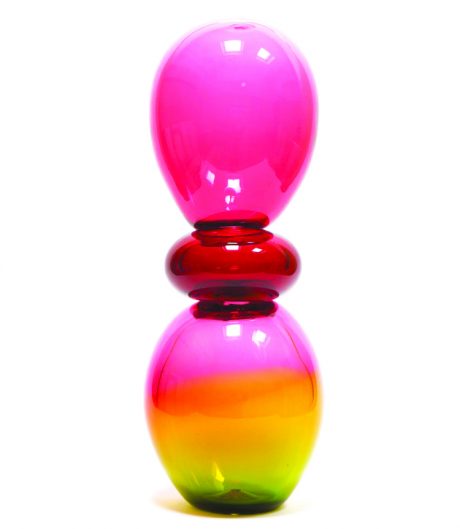 Dans Transparences, Jean-Daniel Salvat et Julius Weiland partagent l’espace avec des œuvres qui se font écho. D’un côté, le peintre scinde ses tableaux en deux parties égales et applique les pigments d’un geste instinctif au revers d’un vinyle transparent, tendu sur un châssis. « Il ne nous dévoile pas les traces de la matière car la surface reste lisse mais détourne un support qui n’est pas prédestiné à être montré. » Le contraste des couleurs révèle la gémellité des toiles et oppose l’exigence – découpage millimétré et fond homogène – à l’expression de la trace intuitive. De l’autre, le travail du plasticien Julius Weiland qui contrôle le process : il place des morceaux de verre (soufflés ou récupérés) dans un moule, déterminant l’espace où tout se joue, avant de les fusionner dans un four – mais ne maîtrise pas les réactions des mouvements du verre qui fond. Jouant sur les volumes, il utilise différentes teintes pour changer notre « perception de l’espace et de la forme ». Son œuvre, entre amas de verre et maîtrise artisanale, dégage une énergie organique, naturelle et gracieuse.