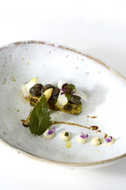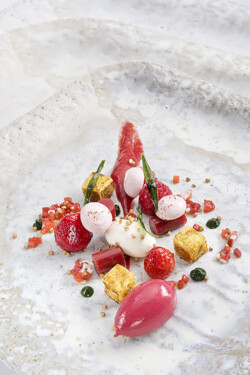 Le classicisme d’une salle voûtée entre joliment en résonance avec une ambiance contemporaine, œuvre du peintre Charles Belle qui s’est fait céramiste pour l’occasion, imaginant une vaisselle singulière aux formes d’une grande richesse. Trônent, somptueuses, deux de ses toiles, odes à la nature : eaux furieuses et écumantes avec cette rivière (2020-22) et herbes entrelacées avec délicatesse dans ceci est une image (2019-22). Ces deux peintures épousent le rapport à la nature d’un chef dont les compositions oscillent entre grands classiques de la maison – comme l’iconique volaille de Bresse au vin jaune et morilles – et créations à l’apparente évidence, sous-tendues par une architecture puissamment sophistiquée. Pensons à une très actuelle déclinaison de la rustique soupe aux bôlons – un petit pain de seigle très sec, jadis consommé trempé dans un bouillon – rehaussé d’une pointe d’oseille. Voilà fine manière d’explorer les saveurs d’antan… Tout aussi terrien est un gros artichaut aux effluves des sous-bois : entre nature domestiquée et sauvage, il n’usurpe pas son appel- lation. On reste également éblouis par l’abstraction graphique toute en carmin et blanc d’un jeu autour de la betterave rouge, dont le caractère noblement terreux s’agrémente avec douceur d’un brochet en mousseline et en consommé à l’hibiscus, conférant une légère touche acidulée à un ensemble plus que cohérent. Steven Naessens semble bien dans ses baskets, libéré de toute contingence autre que créative. Reste à attendre la suite. Avec impatience.