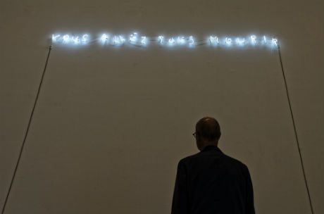 D’une élégance que l’on qualifierait volontiers de british, Mister Mystère est un prêteur anonyme ayant accepté de se séparer temporairement d’œuvres ornant les murs de sa demeure pour les besoins de l’exposition du MAMCS. Il nous attend à l’entrée de la salle dédiée à sa collection personnelle (répondant à la thématique de Passages), placé sous un néon bleu, du genre de ceux que l’on trouve en devanture des magasins. Il rappelle, d’une écriture tremblotante (celle de la mère vieillissante de l’artiste, Claude Lévêque), cette pénible évidence : « Vous allez tous mourir » ! Bienvenue dans l’univers d’un féru d’œuvres traversées par la question du temps qui file, parfois nimbées d’une étrangeté aussi brumeuse qu’une pièce d’Olafur Eliasson. Nous découvrons notamment une série de photos du plasticien danois montrant l’atterrissage d’un avion, « une descente vers l’inconnu, l’infini ».