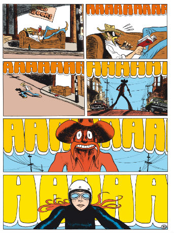 Une longue tige rousse sur une moto rutilante, habillée de trois fois rien : un gilet sans manches, des bottes hautes, un mini short et une maxi ceinture. Le tout en cuir noir. Nancy Sinatra et ses boots faites pour marcher ? Bardot enfourchant sa Harley ? Pravda la Survireuse, l’héroïne de Guy Peellaert. Presque : La Fille, hommage de Blain à l’illustrateur rock’n’roll et auteur psyché de Rock Dreams, ouvrage habité par les icônes Chuck Berry, Roy Orbison ou Ray Davies.