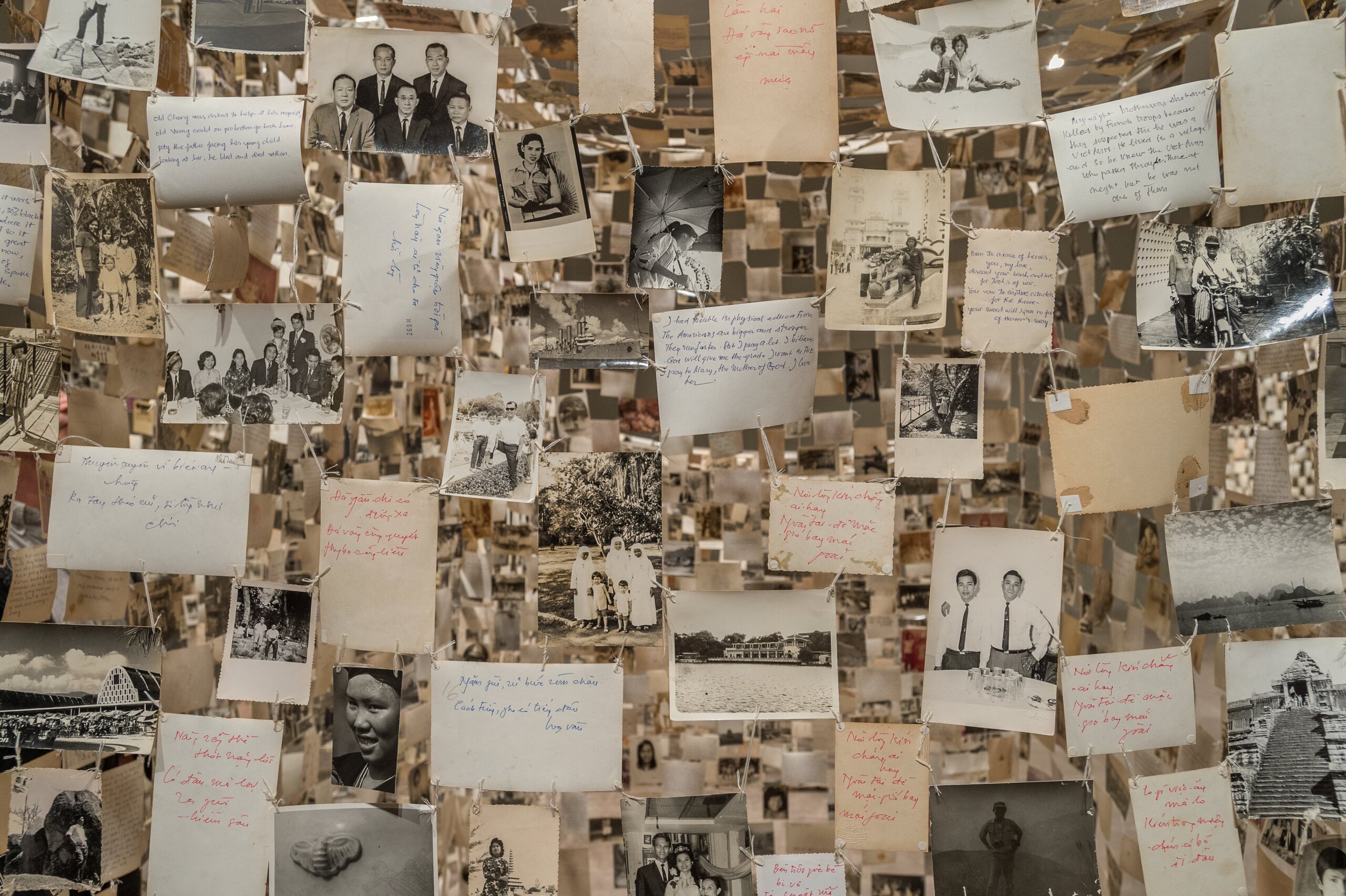 Des photographies par centaines. Prises en Afrique, en Asie, etc. à la fin du XIXe et au début du XXe siècle, elles sont autant de reflets kaléidoscopiques de différents systèmes de domination coloniale. Appartenant aux collections du Musée Rietberg, cet ensemble compose un fil d’Ariane à travers les quatre sections d’une exposition dans laquelle 20 plasticiens contemporains se réapproprient, chacun à leur manière, des images anciennes, utilisant ces fragments d’une histoire souvent douloureuse pour générer de nouvelles narrations. Dans une première partie intitulée Transformatrices, transformateurs, certains redonnent vie à des mémoires occultées, tel Dinh Q. Lê. Pour Crossing the Farther Shore (2014), le Vietnamien a chiné des brassées de clichés, anonymes, pour la plupart pris avant 1975, constituant un gigantesque album de famille imaginaire : portraits, paysages, fêtes, etc. Les assemblant en de fragiles structures parallélépipédiques à la semblance d’autels, il offre un rare témoignage de la vie au Sud-Vietnam avant son effacement par le régime communiste.