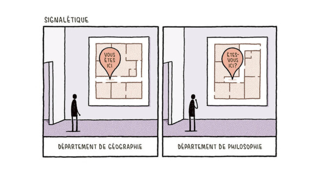 Autant le dire d’emblée, on adore l’humour éminemment british de Tom Gauld, où le non-sens est érigé en art majeur. Les strasbourgeoises Éditions 2042 contribuent à le faire connaître au public français depuis une dizaine d’années, avec des ouvrages comme Vers la ville (2015), La Revanche des bibliothécaires (2022) ou En Cuisine avec Kafka (2017). Avec ce nouvel opus intitulé La Physique pour les chats, l’auteur – qui livre des chroniques dessinées hebdomadaires au Guardian et à New Scientist – emporte son lecteur dans l’univers des savants avec une facétie saupoudrée d’une belle dose d’absurde, rappelant l’immense Glen Baxter.