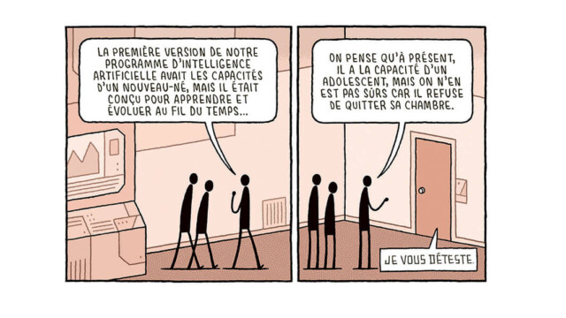 Hilarants et pince-sans-rire à la fois, les strips ici réunis nous font découvrir les vertus insoupçonnées du CHDP (Collisionneur de Hadrons De Poche) ou partir à la rencontre d’une IA au stade de l’adolescence. En quelques cases – une seule, parfois – Tom Gauld fait, en même temps, rire et réfléchir. Chapeau !