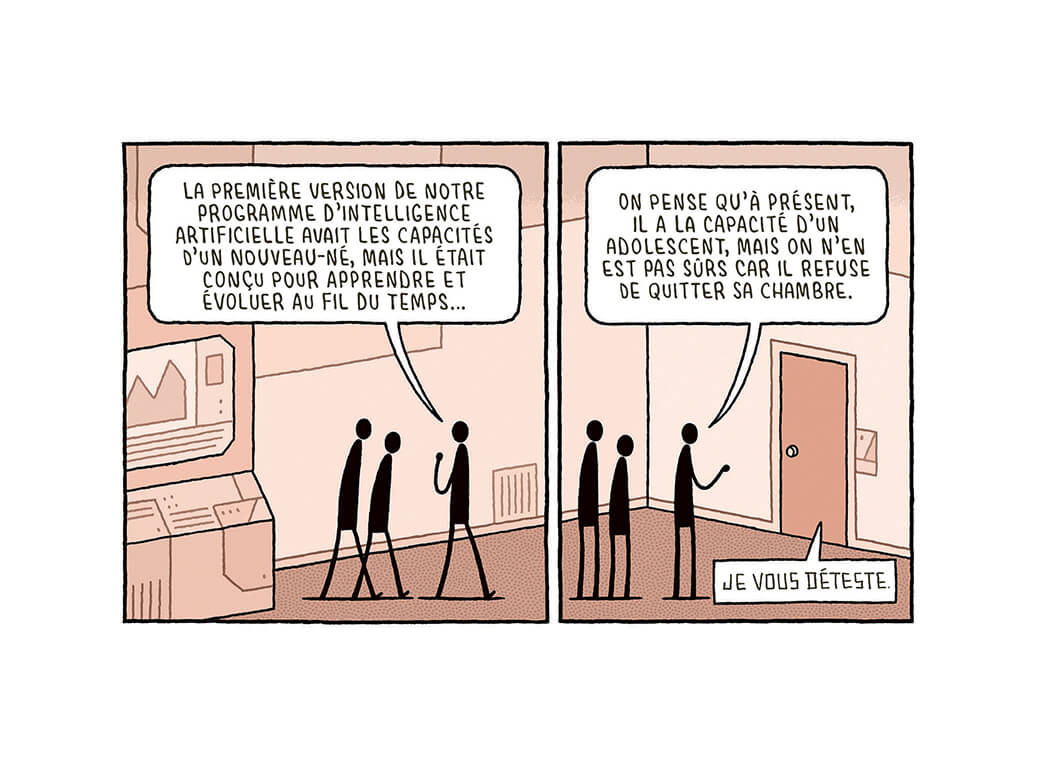 Hilarants et pince-sans-rire à la fois, les strips ici réunis nous font découvrir les vertus insoupçonnées du CHDP (Collisionneur de Hadrons De Poche) ou partir à la rencontre d’une IA au stade de l’adolescence. En quelques cases – une seule, parfois – Tom Gauld fait, en même temps, rire et réfléchir. Chapeau !