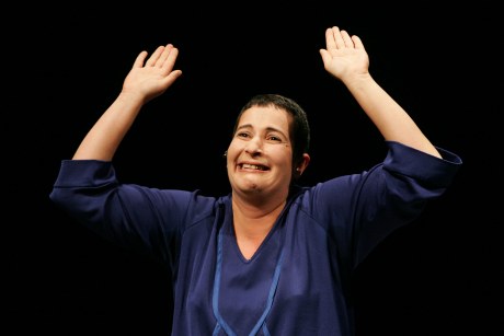 « Âmes sensibles si vous voulez sortir c’est maintenant, parce que pendant le spectacle c’est un peu chiant ! » L’annonce est claire, le ton donné. Sacrifices n’est pas commencé depuis 3 minutes que Nouara Naghouche vous a déjà scotché avec son sketch d’ouverture – dos au public, elle interprète un frère haranguant et menaçant sa petite sœur qui a usé de tous les stratagèmes pour éviter de « passer à la casserole » le soir de la nuit de noce de son mariage arrangé – vous a fait rire en enchaînant sans transition sur la très maniérée Marie-France et invité à sortir si vous n’êtes pas prêt à recevoir son condensé de drame quotidien, de racisme et de violence ordinaires passés au révélateur d’un humour décapant. Elle ne voulait rien d’autre que « secouer l’Atelier du Rhin »[1. devenu la Comédie de l’Est] alors dirigé Matthew Jocelyn qui a totalement misé sur cette comédienne issue d’un quartier de la ville. « Nous voulions appeler le spectacle La Tentation de la chatte et du cochon, annoncer la couleur. Il a fallu qu’on nous explique qu’un centre dramatique ne pourrait pas vendre un spectacle avec un tel titre. » Qu’importe le titre, le spectacle sera fort, intense, remuant.
