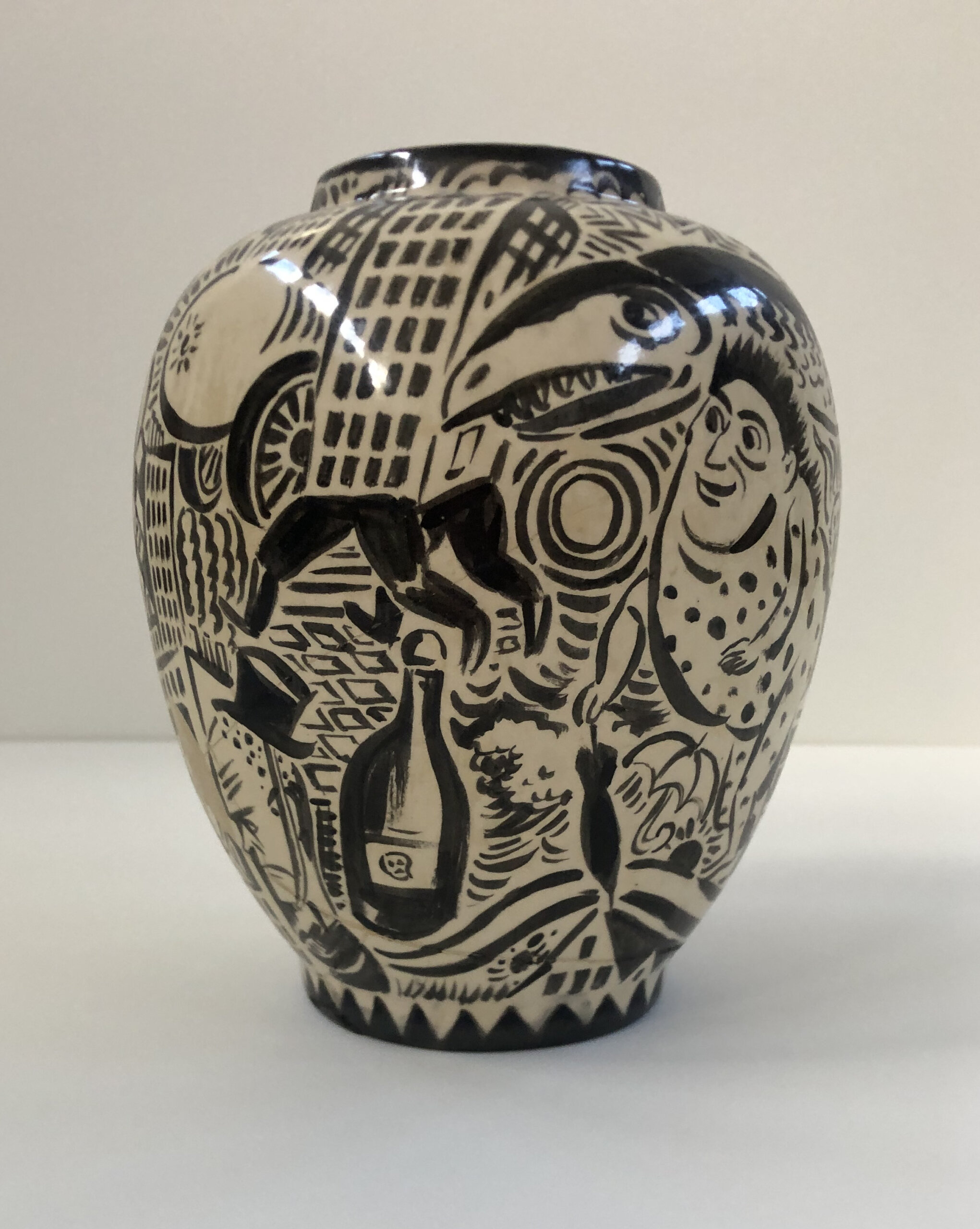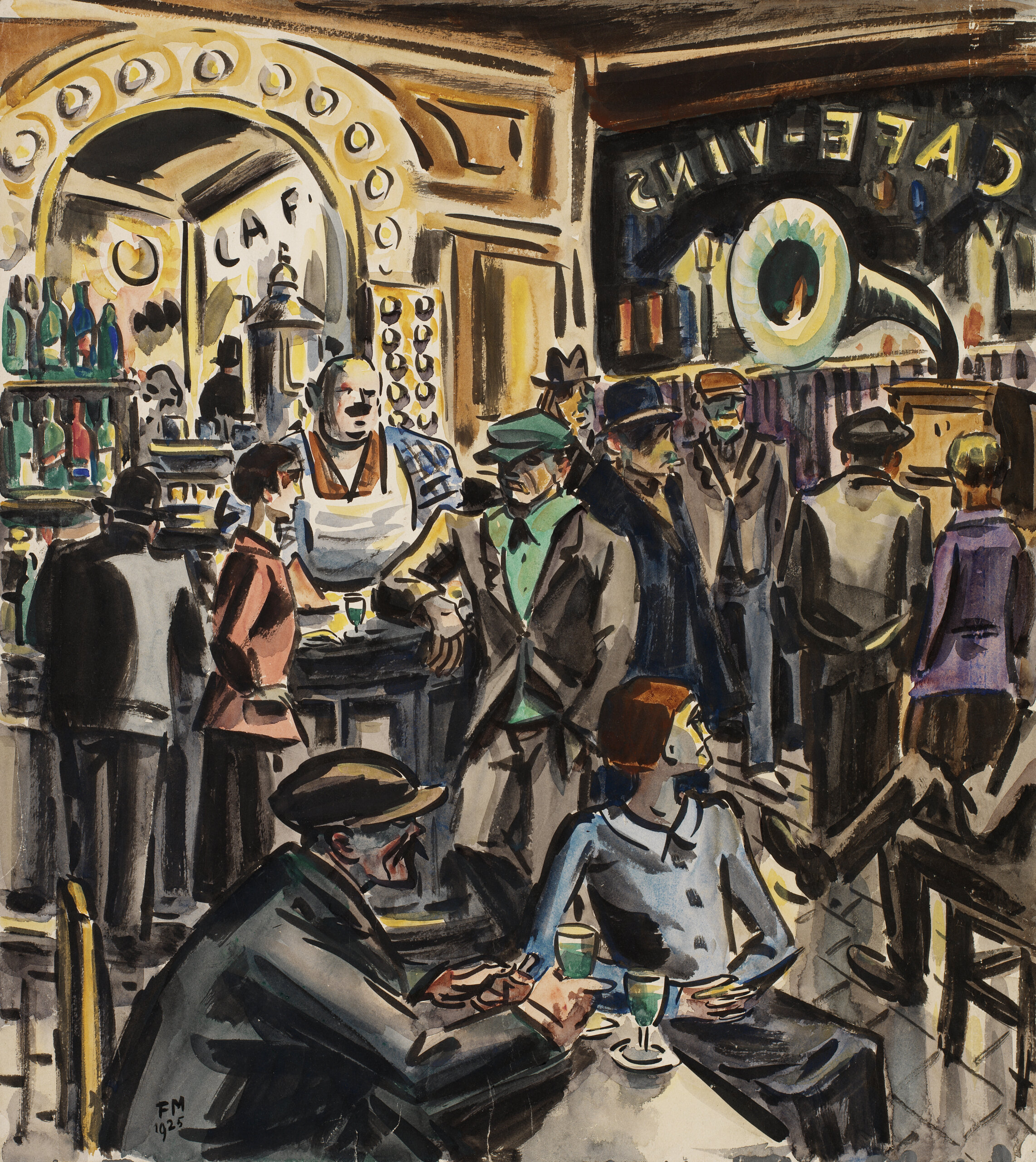 Dans une troisième partie dédiée à la gravure, Masereel s’attaque à la barbarie capitaliste. Les Fumées (1920) révèle par exemple des colonies d’individus, nus et misérables, mélangés aux épaisses émanations sombres s’échappant de cheminées d’usine. Le Baiser (1924), autre tableau urbain, s’arrête pour sa part sur l’étreinte entre un homme et une femme, penchés tendrement l’un vers l’autre depuis la fenêtre de leurs appartements, tandis que la vie grouillante de la métropole pulse tout autour d’eux. De son côté, Histoires sans paroles revient sur le langage novateur dont il est l’instigateur : la création d’un récit imagé sans aucun texte. Précurseur de ce qui s’appellera plus tard le roman graphique, l’artiste publie, dès 1918, 25 Images de la passion d’un homme, épopée tragique d’un idéaliste dans la société moderne. Enfin, si De la couleur fait un crochet par ses aquarelles chatoyantes – Le Petit café (1925) renvoie à l’animation d’un bar parisien, quand L’Écluse (1928) immortalise l’activité portuaire –, Les Arts décoratifs fixe un nouveau volet de ses réalisations. Jusqu’au milieu des années 1950, le Belge a en effet été invité à concevoir bas-reliefs, vitraux et autres faïences, notamment le décor d’un vase (1925) reproduisant une scène de Grotesk-Film (1921), ouvrage publié aux éditions berlinoises J.B. Neumann.