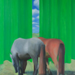 En s’émancipant du modèle photographique et d’un certain réalisme, qui confortait peut-être trop confortablement son talent, Marius Pons de Vincent a relancé la machine à peindre dans une direction imprévue. Ce sont d’abord des dizaines de petits autoportraits, souvent exécutés très rapidement, où un sévère profil de proconsul exclut toute lecture psychologisante. C’est surtout la série Studio, hantée par un vert d’incrustation qui installe fermement une distance envers la représentation. Les références à Uccello et Whistler sont explicites dans Studio 2 et Papa, où un rideau, comme découpé dans une Annonciation de la Renaissance, s’interpose, pellicule de fiction, entre réalité et figuration. Studio 4 (Aurélie) met en scène une étrange allégorie : une jeune peintre en culotte se glisse sous la couverture recouvrant un chevalet, comme pour dérober à Marius un secret d’artiste. De cette plongée dans la chambre obscure émane une tête de cheval encadrée au mur, que le chevalet semble débiter comme un Polaroïd. Le regard de Marius sur le nu, le sexe, la nature, a perdu de sa naïveté. Ce que son corps produit dans la solitude de l’atelier, c’est de la peinture.