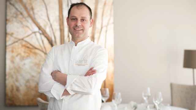 La trajectoire est exemplaire. Ouverte en octobre 2016, La Merise est distinguée d’une première Étoile au Guide Michelin en 2018, puis d’une deuxième, en 2021. Exemplaire, le parcours du chef Cédric Deckert (né en 1981) l’est tout autant. Celui qui a grandi à Avolsheim passe par des adresses prestigieuses, du Cygne de Gundershoffen – rayonnant alors sous la houlette de François Paul – au Jardin des Sens, maison montpelliéraine culte des frères (jumeaux) Pourcel. C’est néanmoins à L’Arnsbourg qu’il reste le plus longtemps : dix-sept ans aux côtés de Jean-Georges Klein, auquel un cappuccino de pommes de terre et truffes sensuel et satiné rend hommage à la carte. Il a par ailleurs pris part à de nombreux concours, atteignant la finale internationale des exigeantes Olympiades des métiers à Séoul, en 2001. Une expérience formatrice en diable : « Sophrologie, sport de haut niveau, récupération… Nous étions coachés par Daniel Levavasseur – entraîneur de la double championne olympique Laura Flessel – car il fallait repousser nos limites chaque jour », résume-t-il.