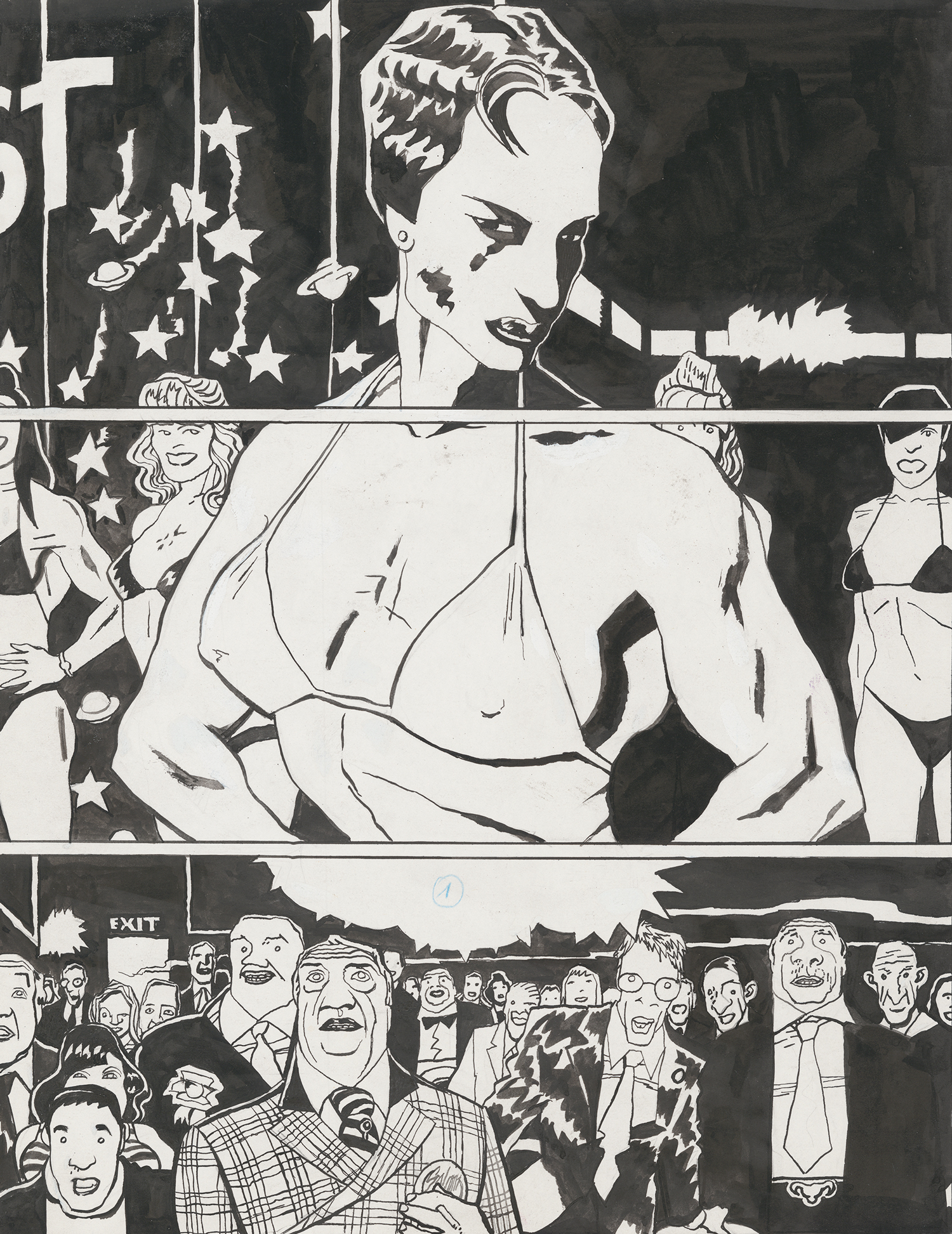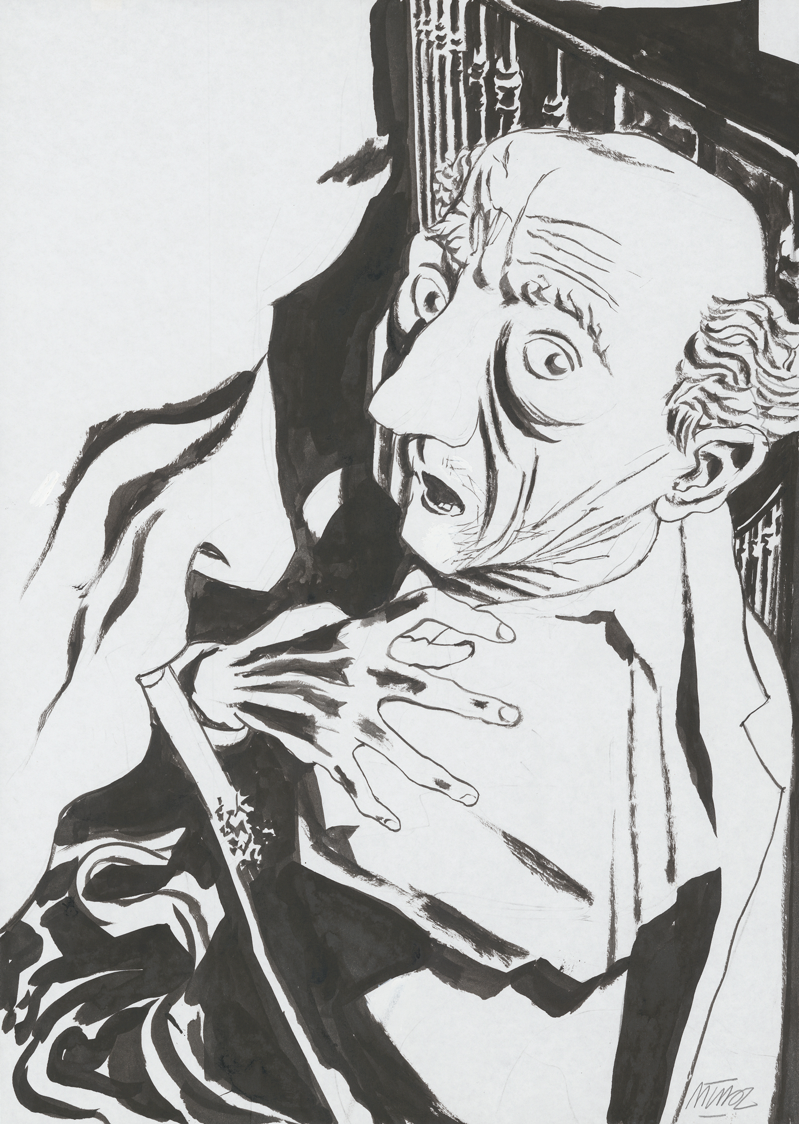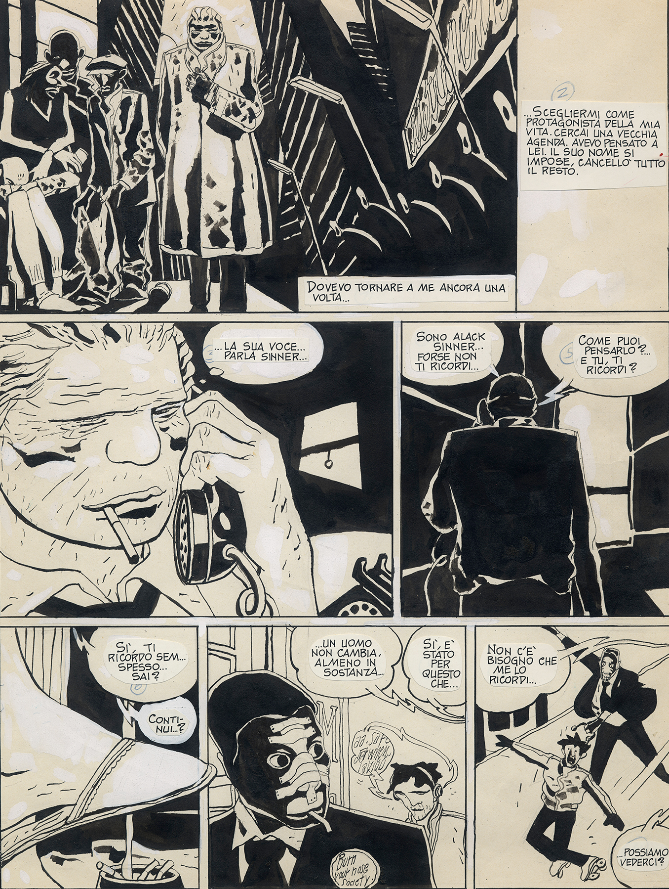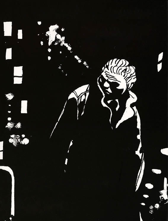 « Je suis le fils de l’expressionnisme diurne d’Hugo Pratt et de l’expressionnisme nocturne d’Alberto Breccia », s’amuse José Muñoz (né en 1942). Notre homme les a bien connus, tout comme Solano López qu’il assista, adolescent, sur les dernières planches de la saga culte L’Éternaute. Mais c’est après avoir émigré en Europe, au début des seventies, que l’Argentin se fait connaître avec une saga policière hard-boiled scénarisée par son compatriote Carlos Sampayo : les planches originales de la série Alack Sinner (dont le méconnu Precinto 56 est une sorte de précurseur) ouvrent l’exposition. Voilà un sacré personnage au nom prédestiné (qu’on pourrait traduire par « pauvre de moi, pauvre pécheur ») et au physique évoquant un mix de Chuck Connors, Richard Burton et Steve McQueen. Ancien flic blasé devenu privé, mais aussi chauffeur de taxi interlope, cet (anti) héros violent, mélancolique, solitaire et alcoolo emporte le lecteur au cœur d’un NY sombre qui fait penser au Buenos Aires décrit par Roberto Arlt dans ses romans, « une ville livide, un univers désespéré dont les habitants pleurent des larmes de rage », résume le Grand prix de la ville d’Angoulême 2007. Sur ces histoires éminemment politiques (avec des références au Vietnam, au Nicaragua, etc.) en forme de critique sociale, planent les ombres de Dashiell Hammett, Raymond Chandler et de films comme Mean Streets de Martin Scorcese ou Le grand chantage d’Alexander Mackendrick. « Chaque case est quelque chose de soudain, d’indépendant, une fulgurance », déclare un créateur toujours sur la frontière : entre ombre d’un noir absolu et lumière crue, entre figuration et abstraction…
