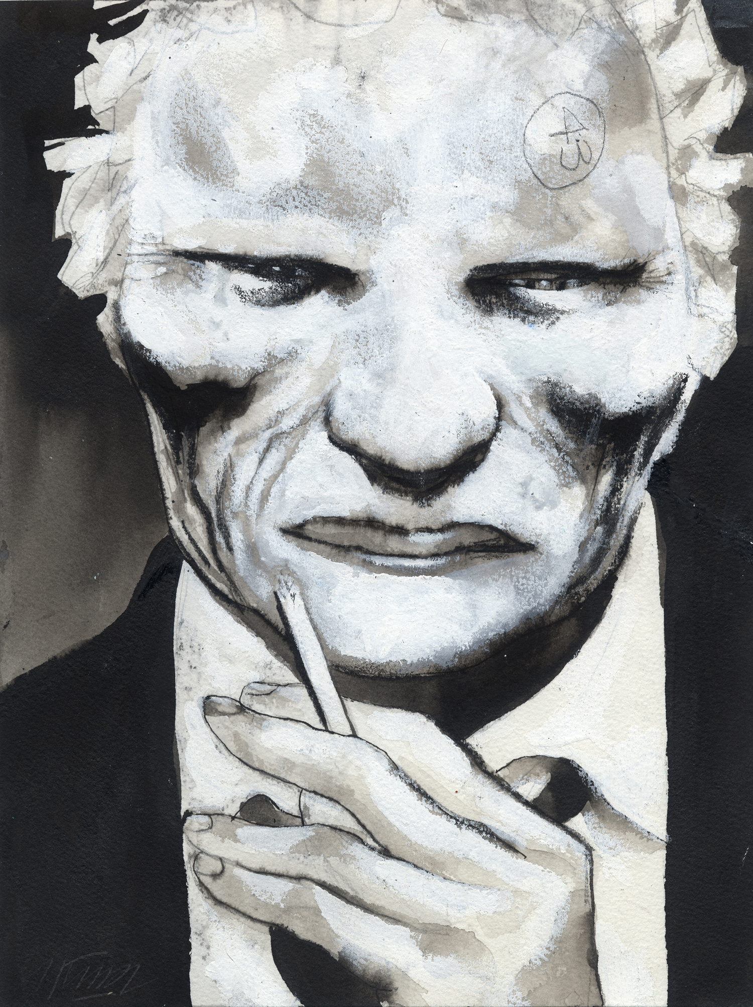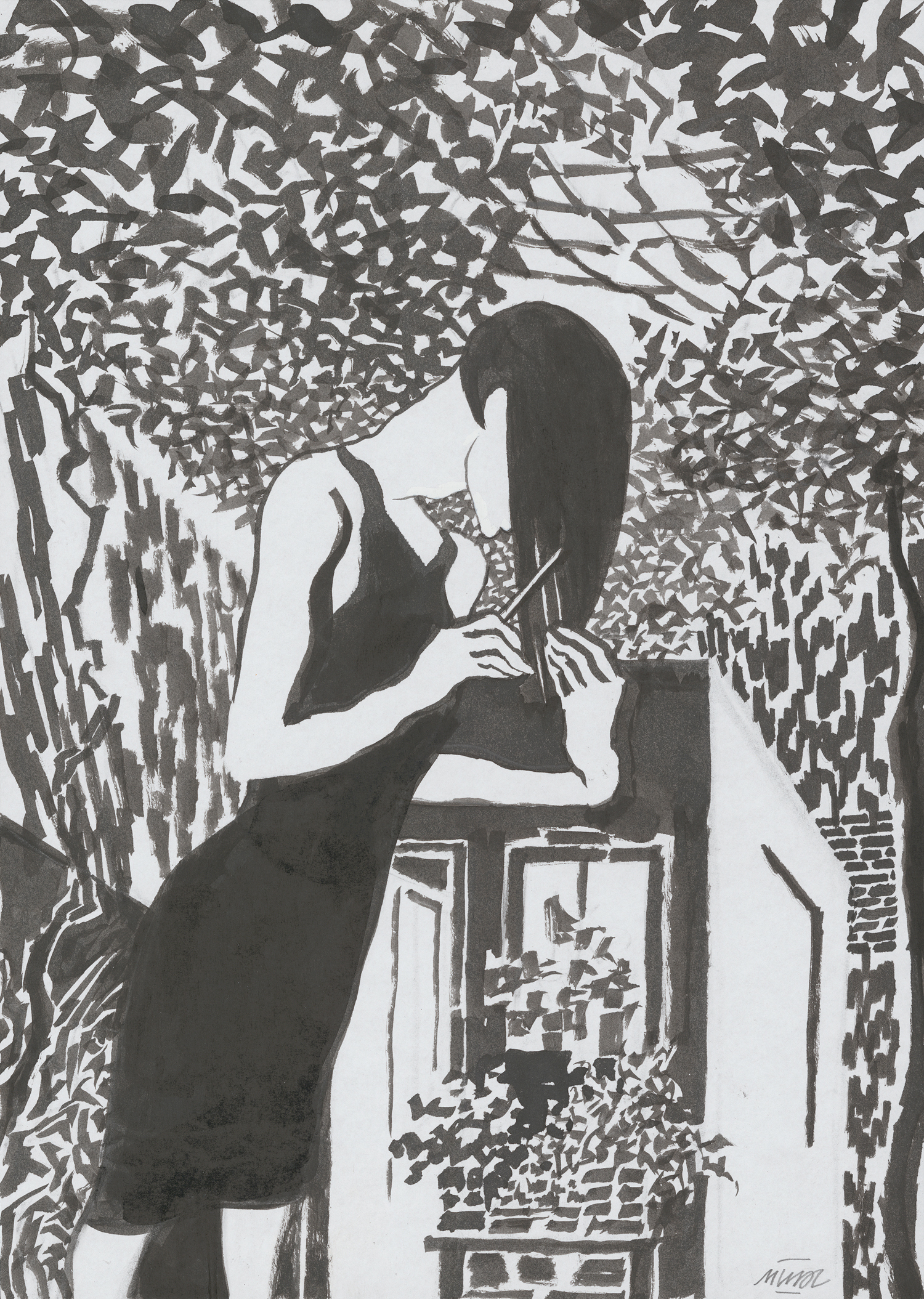 Dans le dédale des salles, se déploie l’art d’un auteur qui sait dépasser les univers désenchantés du Bar à Joe – autre série marquante en forme d’immersion dans un rade d’une Amérique déglingue. Se découvrent ainsi de superbes portraits à l’encre de Chine (notamment celui d’une femme se coupant une mèche de cheveux d’un érotisme délicat) qui rappellent parfois étrangement Modigliani, de récentes échappées paysagères, éclatantes de couleurs (pour une fois !), sur les traces de Van Gogh auxquelles une salle est dédiée, ou encore des illustrations pour L’Étranger de Camus… Le parcours s’achève entre les portraits de Billie Holiday (et d’une palanquée de jazzmen) et les évocations de tango, autour de Carlos Gardel : l’espace est baigné de musique. La bande-son du lieu a été choisie par José Muñoz, comme une mise en musique de son univers graphique : s’y croisent Chet Baker et Rosita Quiroga, Hernán Oliva et Bix Beiderbecke.