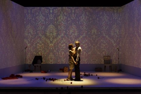 Après s’être frottée aux mythiques Macbeth et sa Lady, Anne-Laure Liégeois, qui signe la mise en scène et la scénographie, désirait pénétrer dans une nouvelle relation : « Je souhaitais prolonger la réflexion sur le lien, très intime existant entre le pouvoir et le couple dans un temps qui n’est pas si loin de nous. J’ai un souvenir très présent et marquant de ce “faux” procès, suivi de la fusillade des Ceauşescu à la télévision, en 1989. » Profondément liée avec l’histoire de la Roumanie, la metteure en scène confie alors l’écriture de sa pièce à David Lescot : « J’ai eu envie de travailler avec lui, parce que je suis très sensible à la musicalité qui émane de sa langue, de ses mots. Mais aussi parce qu’il a beaucoup écrit sur le communisme et a un fort intérêt pour l’Histoire et pour ce pays. » Ainsi, l’auteur nous plonge dans la biographie de ces Époux, ou plutôt dans une comédie noire et terrible, où tout ce qui est raconté est véritable mais dans « l’ensemble ne répond pas à la plastique d’un documentaire parce qu’il est étiré par le théâtre et ses artifices », confie la metteuse en scène. Enfermés par des murs blancs, les acteurs tantôt eux-mêmes, tantôt narrateurs ou époux, attrapent leurs accessoires comme des rats à travers une trappe au lointain. Progressivement, l’espace se fait envahir par des images projetées sur les parois. Du papier peint délabré de leur début misérable à leur cage dorée, témoin de tous les excès du couple jusqu’à leur procès, nous suivons les outrances et anecdotes burlesques de ces deux mégalomanes, toujours avec humour, un bon moyen de réinterroger l’Histoire.