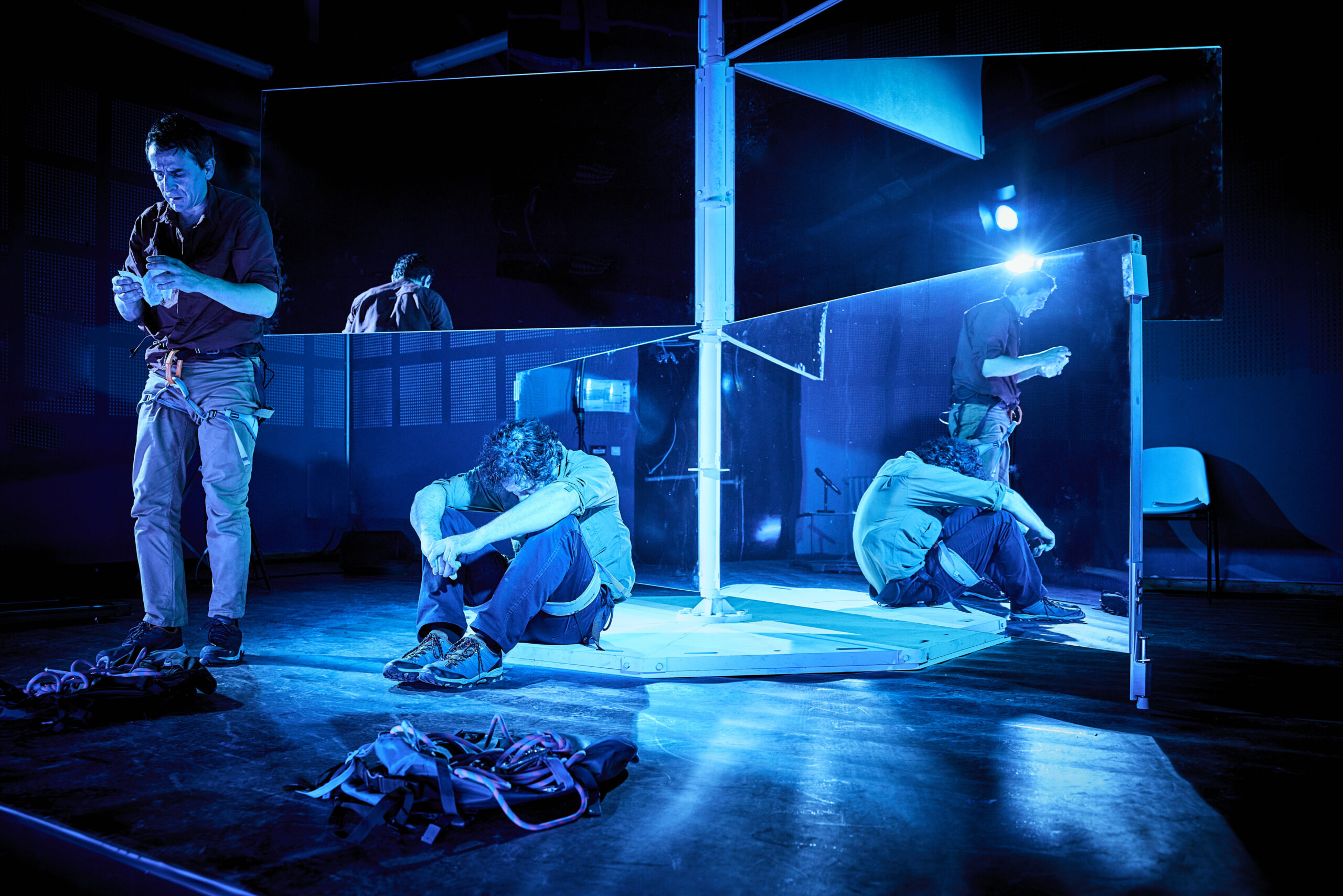 Manifestation franco-allemande pilotée depuis un an par Kira Kirsch, sa nouvelle directrice artistique, Perspectives mêle propositions circassiennes, performances dansées, théâtrales mais aussi lectures interrogeant les relations entre les individus. Parmi les trois spectacles qui rythment la journée d’inauguration, deux reposent sur les lois de l’équilibre : La Lévitation réelle (21/05, St Johanner Markt & 22/05, Jardin franco-allemand, Sarrebruck), forme courte signée Camille Boitel, et ØBLíK (21/05, Landwehrplatz, Sarrebruck & 23/05, Parc archéologique européen, Bliesbruck). Dans ce solo, Theresa Kuhn expérimente la gravité sur sangle souple, offrant un récit imprévisible et saisissant. La pièce Une Ombre vorace (21/05, Scène de l’Hôtel de Ville, Sarreguemines & 22/05, Aula (Festsaal), Sulzbach, dès 12 ans, en français surtitré en allemand) raconte pour sa part le destin d’un alpiniste fictif disparu en pleine montagne. 30 ans plus tard, son fils met tout en œuvre pour retrouver son corps. Face à nous, deux interprètes jouent avec la dualité : tandis que l’un incarne le protagoniste, l’autre se glisse dans son double cinématographique, son aventure se retrouvant portée sur grand écran.