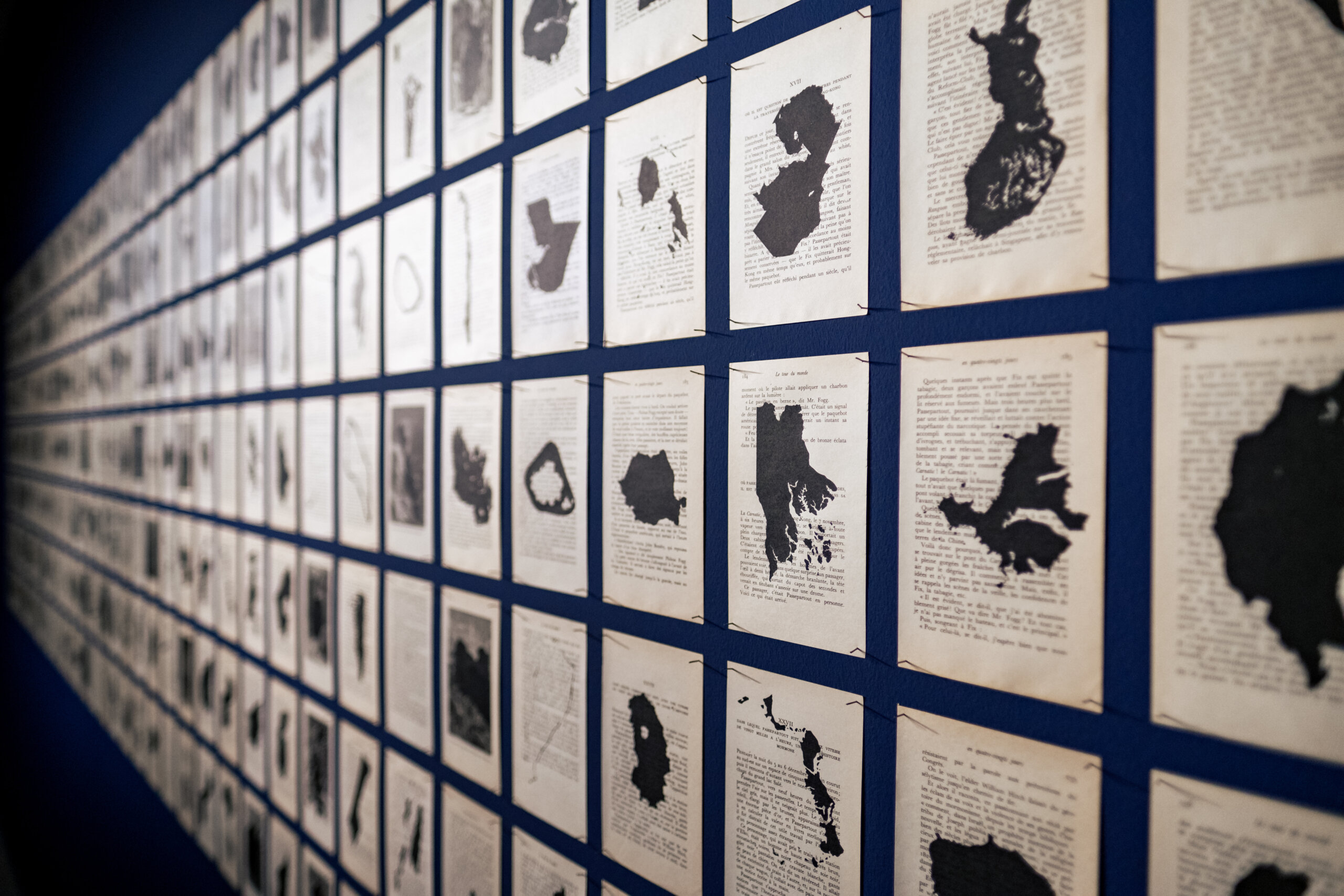 Créé en 2011 par la Fondation François Schneider, le concours Talents contemporains part tous les ans à la recherche d’artistes internationaux faisant de l’eau un axe majeur de leur travail. Irriguant toutes les éditions, cette question est, cette année, rapprochée des crises environnementales et autres enjeux liés à l’immigration. À travers l’impression de cartes de différents pays, îles et archipels sur les pages du Tour du monde en 80 jours de Jules Verne, Les Possessions (2014) d’Aurélien Mauplot interroge ainsi les notions de nation et de propriété au fil de l’Histoire. « Plus de 332 pages, rangées par ordre chronologique, sont placées sur un mur bleu rappelant la couleur des mers et océans », souligne Sarah Guilain, commissaire de l’exposition. Au milieu de chacune d’entre elles, de petites formes noires se détachent. « Il n’y a pas d’organisation particulière expliquant pourquoi tel pays se retrouve sur telle page, sauf en ce qui concerne la dernière », poursuit-elle. L’ultime feuille fait en effet référence à l’île de la Possession, située dans l’archipel Crozet, au sud-ouest de l’Océan Indien. 57 fois plus petite que la Corse, elle donne son nom à l’exposition et doit le sien à Julien Crozet, officier de marine qui, en 1772, s’est exclamé « Au nom de la France, je prends possession de cette île ; cette île s’appellera l’île de la Possession ! ».