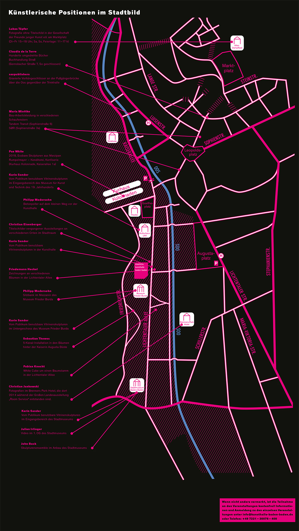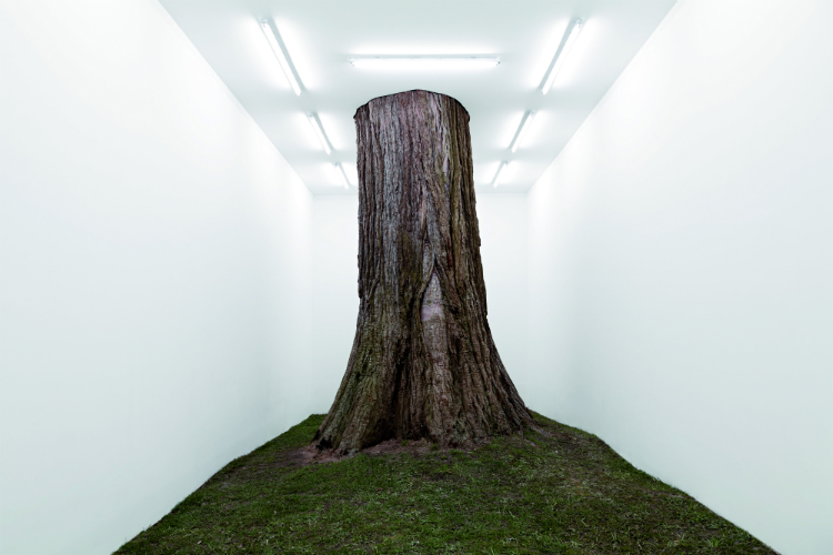 Les propositions contemporaines peuplent les espaces comme la Prise électrique de Musée de Kamen Stoyanov, interrogation sur le statut des infrastructures techniques indispensables à l’exposition, ou la vidéo d’Andrea Fraser Little Frank and His Carp, dans laquelle l’artiste questionne de manière mutine la pertinence des audioguides. Avec sa vision futuriste, la plasticienne polonaise Goshka Macuga revisite, pour sa part, le révolutionnaire Cabinet des abstraits exécuté par El Lissitzky pour présenter la collection d’Art moderne du Landesmuseum de Hanovre, dans les années 1920. Créées spécialement, Les Fenêtres de Simon Dybbroe Møller repensent le rapport dedans / dehors : elles s’ouvrent sur les murs de la Kunsthalle, mais permettent de s’en abstraire avec leur échappées belles de billets de banque et de feuilles qui semblent emportés par le vent. Il était logique que le cheminement se poursuive hors les murs dans une vingtaine de lieux de la cité : un arbre vieux de 140 ans emprisonné dans un white cube préfab’ éclairé au néon construit sur la Lichtentaler Allee – effet wahou garanti pour cette autre variation inside / outside de Fabian Knecht –, deux appétissants gâteaux