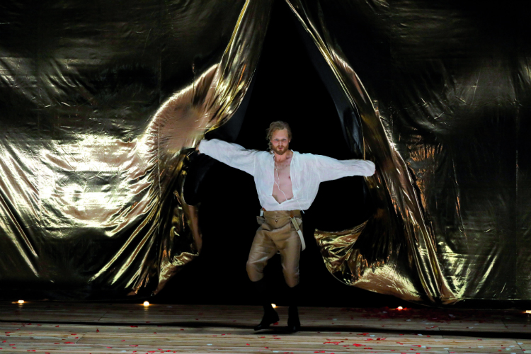Dans un décor / arène nu dans lequel scintillent des boules lumineuses de verre de Murano (voilà pour le Don Giovanni made in Italy) – symbolisant, chacune, une conquête du séducteur – le metteur en scène déploie sa vision de Don Juan. Il est un « homme insaisissable dans tous les sens du terme, qui fait de sa vie un hymne à la gloire du plaisir et de la jouissance, mais surtout un hors-la-loi qui n’aura pas été jugé par la justice des hommes et qui, toutes proportions gardées, ne s’en tire pas si mal », un éternel adolescent en perruque blonde peroxydée, sorte de double de l’Amadeus de Miloš Forman en quête de liberté absolue, un mot écrit en lettres de sang (et en italien) sur le mur marquant le fond de scène.