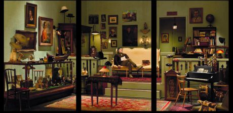 Le ton est donné dès l’entrée de l’exposition : Antiquarian Sleeping in his Shop (2017) accueille le visiteur. Ce triptyque monumental – cinq mètres cinquante de long sur deux soixante-quinze de haut et près de vingt centimètres de profondeur – est une des plus récentes œuvres de Rodney Graham, illustrant son modus operandi favori : monter des photographies dans des caissons lumineux, immenses boîtes qui leur donnent une coloration hyper réelle. Le modèle ? L’artiste canadien lui-même, personnage d’une certaine manière secondaire – contrairement à une Cindy Sherman qui écrase l’espace – posé dans un décor conférant son véritable sens à l’ensemble. Ici, il incarne un antiquaire somnolant dans son échoppe chic, plutôt cabinet de curiosités que broc’. Le regard erre, explorant un fourmillement de détails aussi importants les uns que les autres (comme le livre de Harry Smith posé sur le ventre du personnage), se perd au cœur d’un intérieur figé dans un passé élégant, illustrant avec malice et finesse le danger de la nostalgie, tout autant que la fascination qu’elle peut générer. Un brin ironique, le plasticien multiplie les références avec un travail narratif d’une extrême subtilité rappelant celui de Jeff Wall – un autre membre de l’École de Vancouver, tout comme Stan Douglas ou Ken Lum – qui utilise, lui aussi, le principe du rétro éclairage.